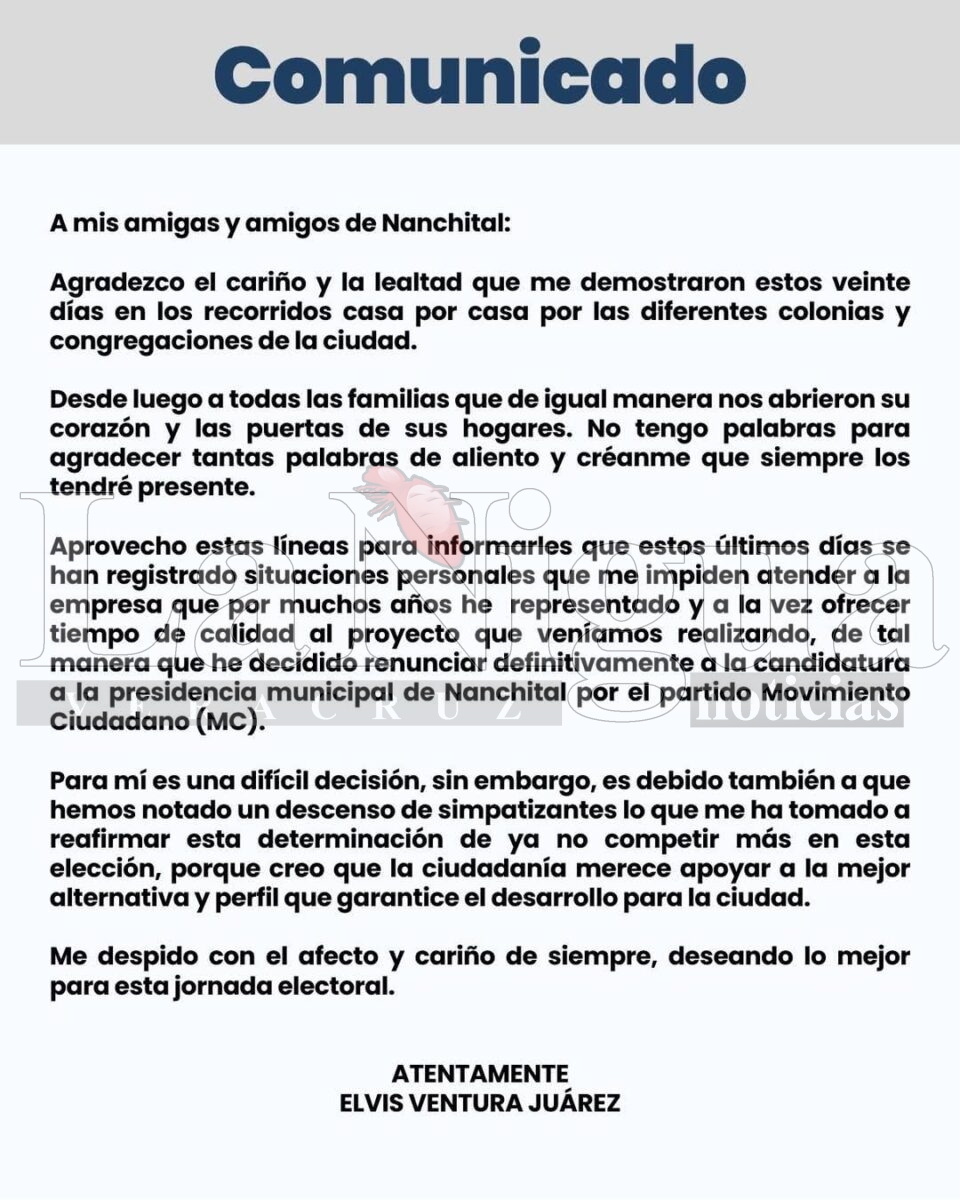 “Condeno todo acto de violencia e intimidación, venga de donde venga. No permitiré que la desinformación dañe a Nanchital. Por el bien de mi familia y de mi pueblo, he decidido hacerme a un lado”, declaró Ventura en un video difundido tras su renuncia.