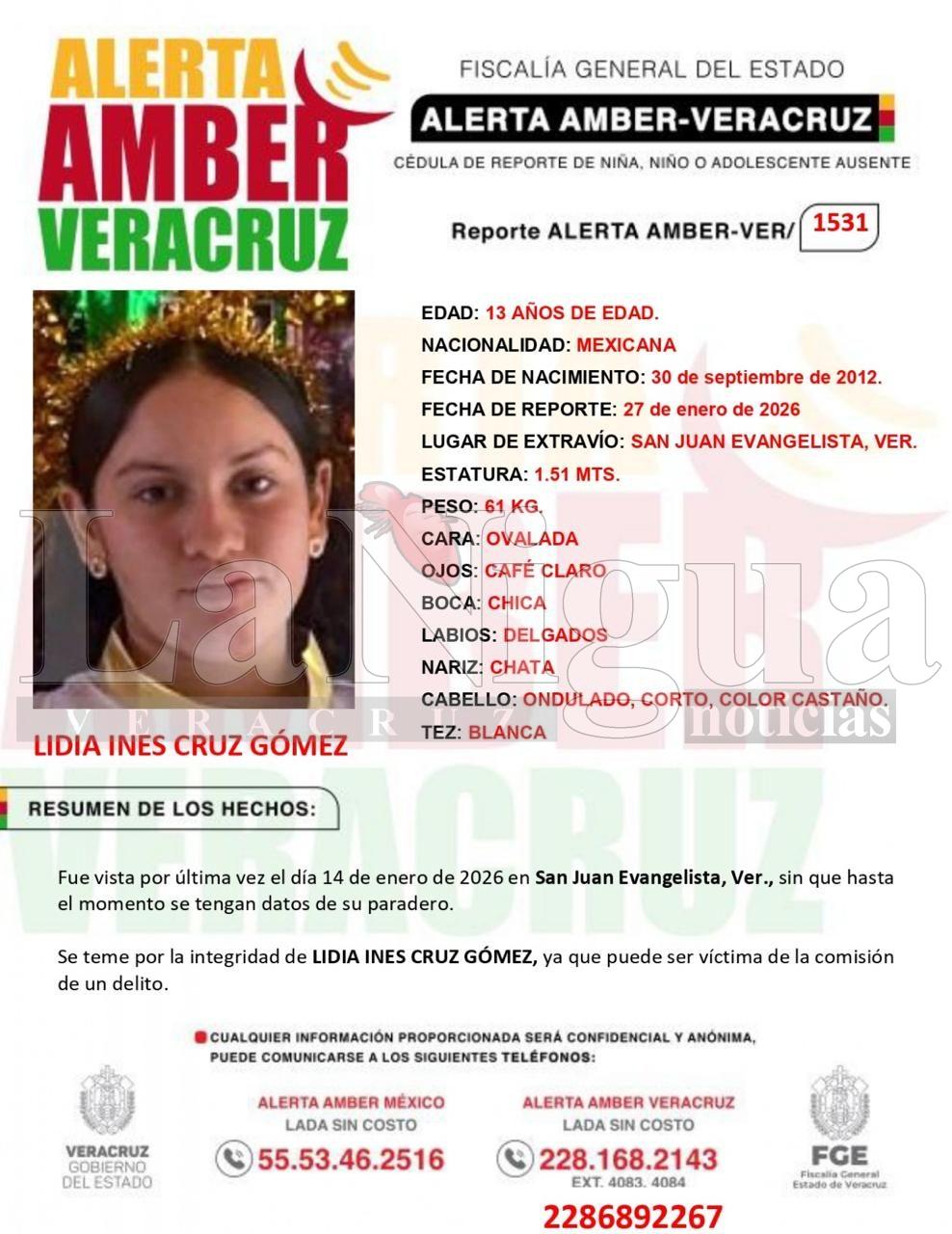 Alerta Amber Veracruz emitió alerta por la desaparición de la menor Lidia Inés Cruz Gómez, de 13 años, de quien no se sabe su paradero desde el pasado 14 de enero, se cree que corre riesgo por lo cual se pide a toda la población aportar información para localizarla.