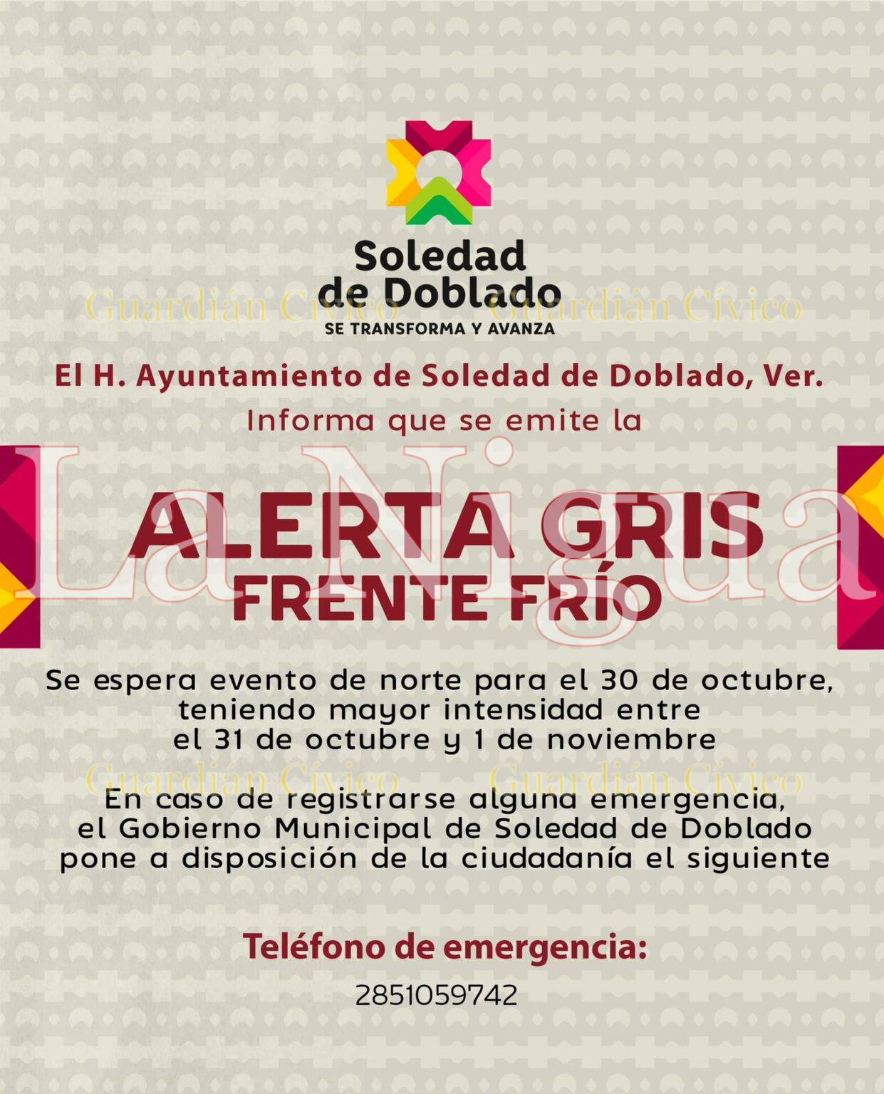 Soledad de Doblado, Ver.- Las autoridades municipales emitieron una alerta gris por condiciones meteorológicas que se esperan esta lunes 30 y martes 31 de octubre, a causa de un Frente Frío que podría ocasionar daños a las personas que no estén preparadas.