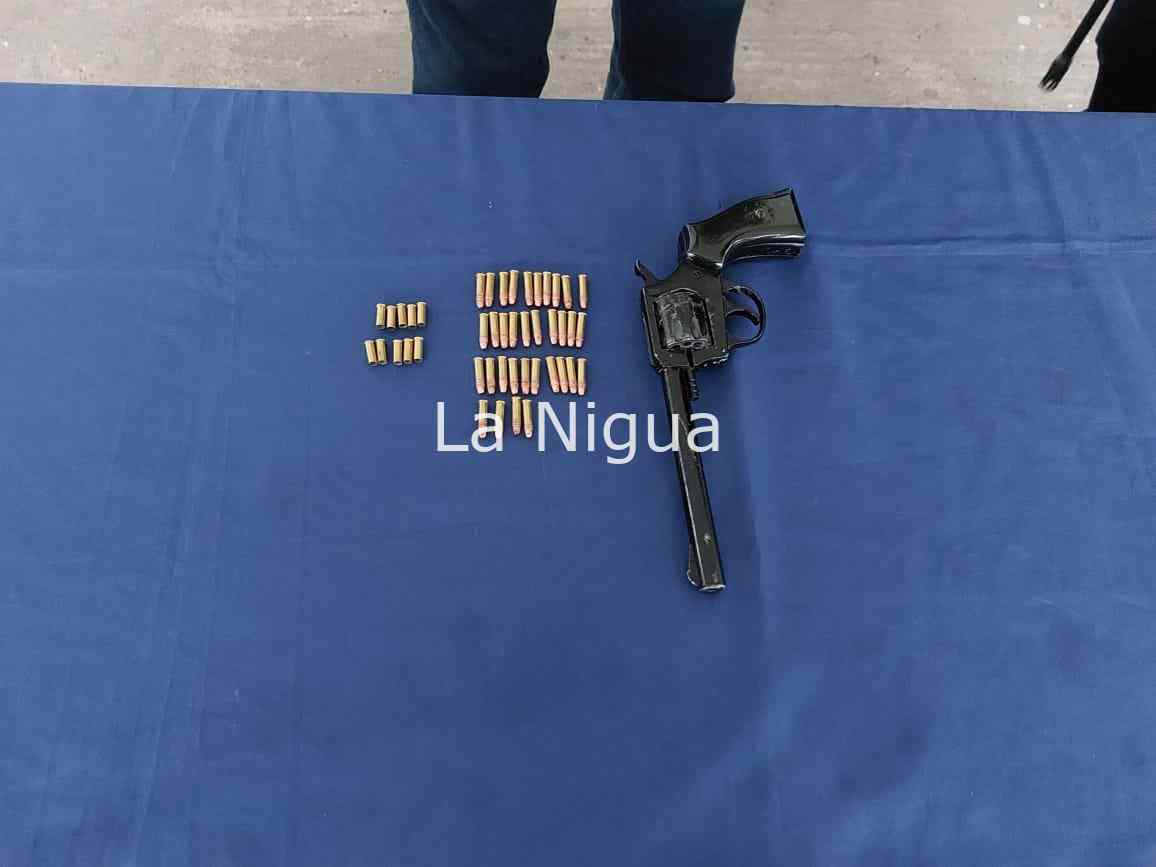 Siendo asegurada, una pistola tipo revolver de color negro con calibre .22, que se encontraba abastecida junto con varios cartuchos percutidos, otros más en la bolsa de su pantalón; dando un total de 28 cartuchos útiles de calibre .22