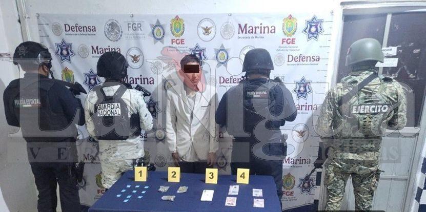 Como parte del apoyo a cateos realizados por la Fiscalía General del Estado, fue detenida una persona y se decomisaron nueve dosis y una bolsita de presunto cristal, 16 dosis de hierba seca con características similares a la marihuana, pipas de cristal, pasamontañas, camisolas tipo militar, gorras y una tabla de castigo.