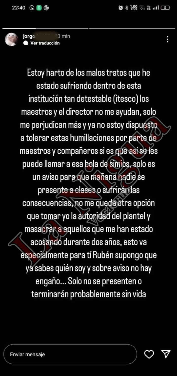“Estoy harto de los malos tratos que he estado sufriendo dentro de esta institución tan detestable (ITESCO)… solo es un aviso para que mañana nadie se presente a clases o sufrirán las consecuencias”, decía uno de los mensajes.