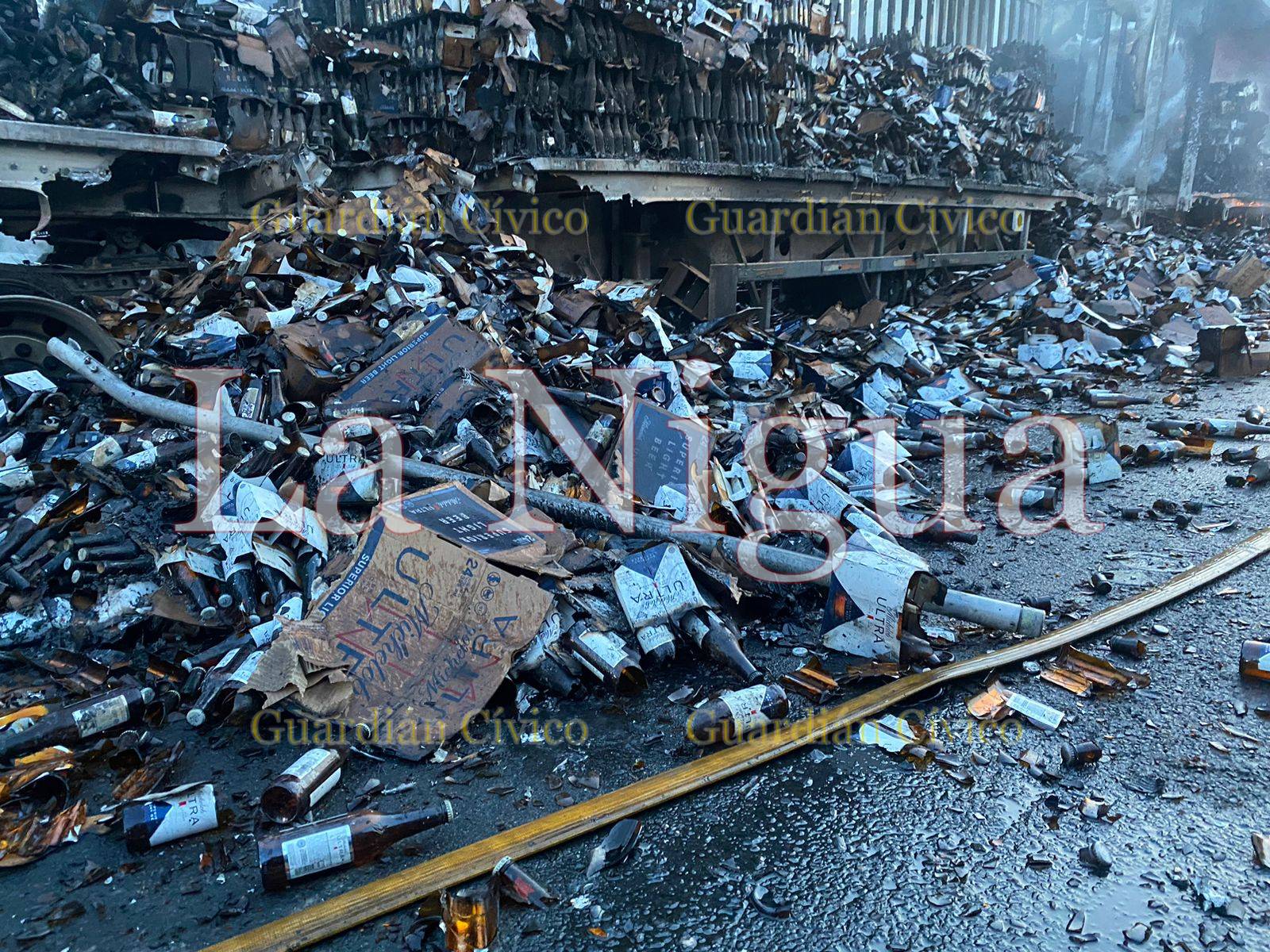 Tras el impacto, el volteo salió proyectado a la valla metálica, en tanto el doble remolque continuó su trayecto metros adelante, para incendiarse y culminar totalmente calcinado.