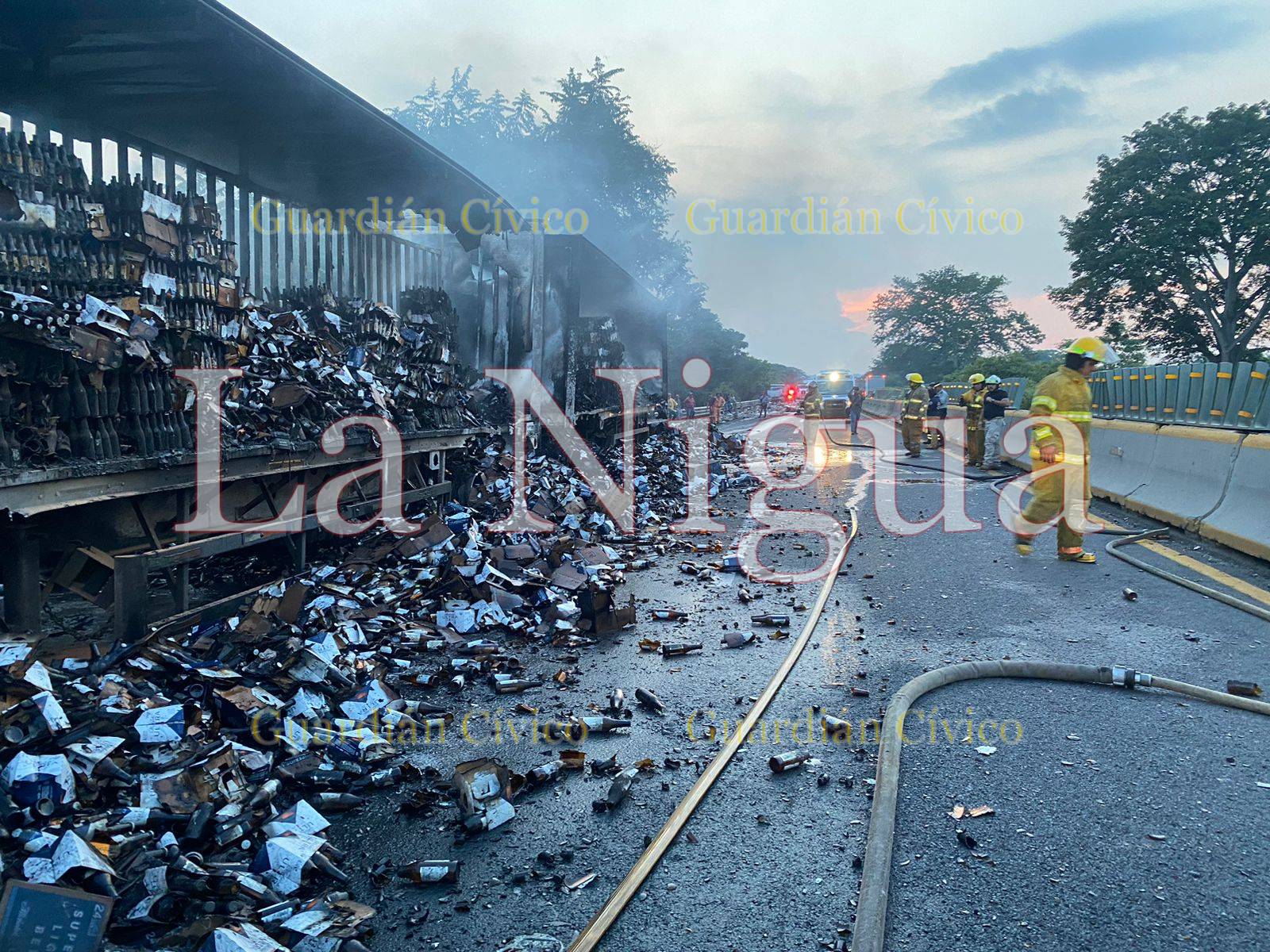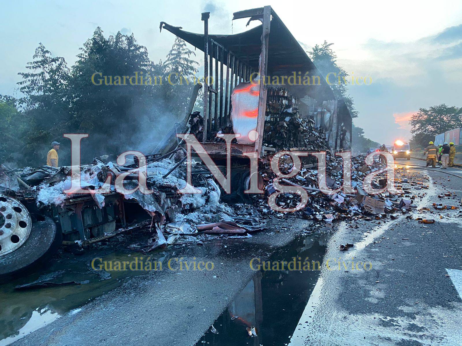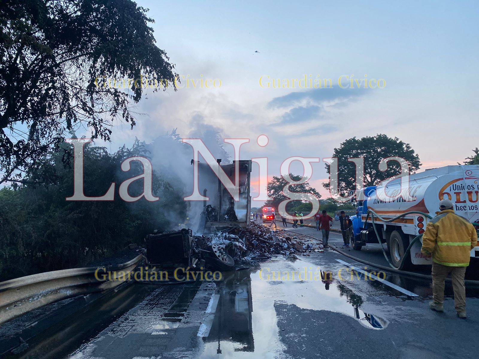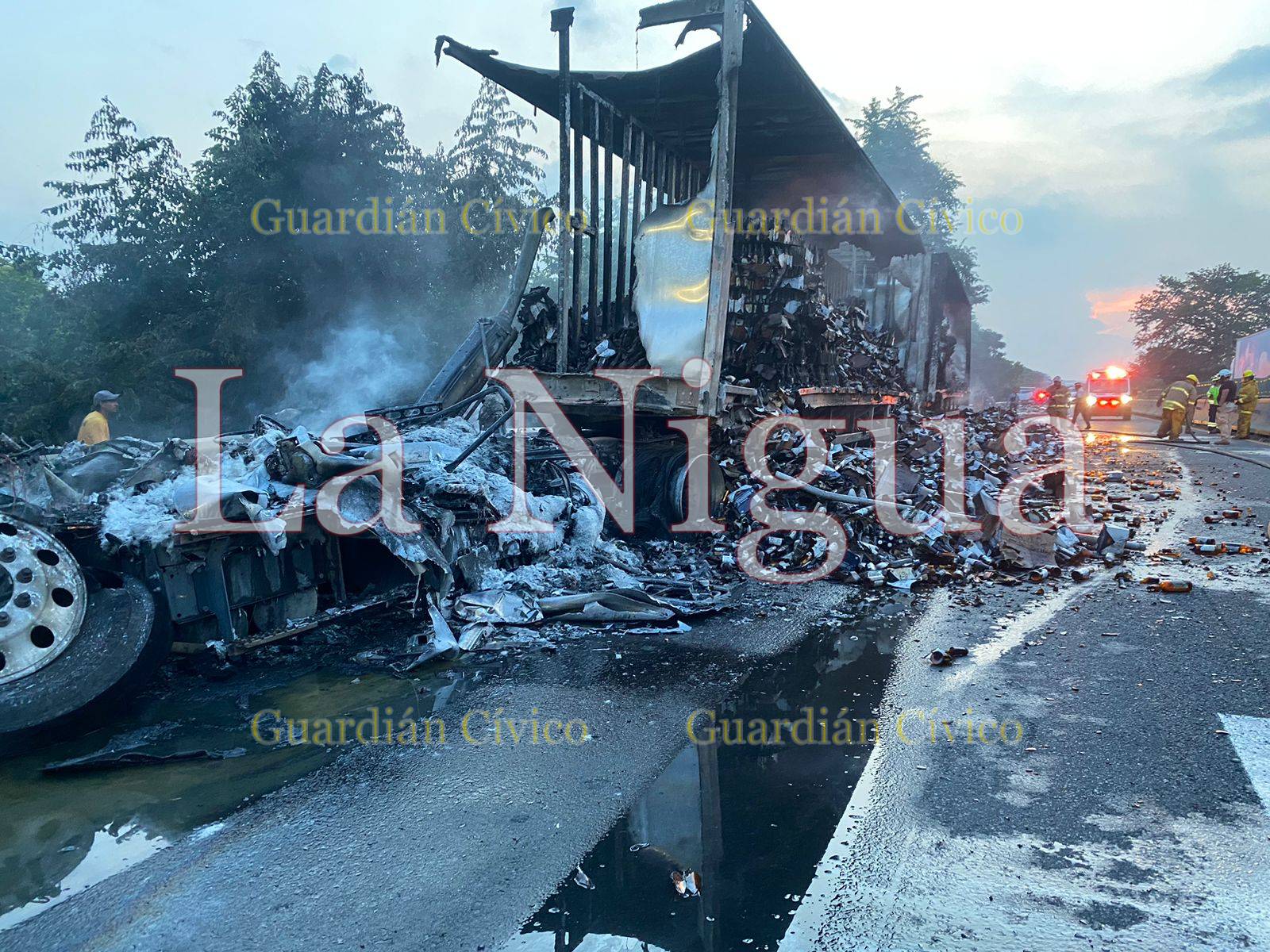 Acayucan, Veracruz.- Un tractocamión tipo doble remolque cargado de cervezas de la marca Ultra, se incendió tras un chocar por alcance sobre la autopista La Tinaja – Cosoleacaque, al sur de la entidad veracruzana.