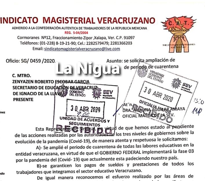 Uno de los sindicatos estales que están preocupados por sus agremiados y que la semana pasada giraron un oficio al secretario de la secretaría de educación de Veracruz (SEV), Zenyazen Roberto Escobar García, no han tenido respuesta, así lo manifestó el secretario general del sindicato magisterial veracruzano (SMV), Licenciado. Ramón Domínguez Polo, entregamos el oficio en unos de los puntos le solicitamos que se amplíe el periodo de la cuarentena de todas las labores educativas, administrativas y de personal de apoyo en toda la entidad veracruzana, en virtud de que el Gobierno federal implementará la fase 03 por la pandemia el coronavirus covid-19, que actualmente padece nuestro país.