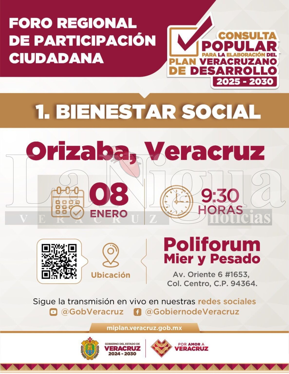 Xalapa, Ver., martes 07 de enero de 2025.- Con en el tema Bienestar Social, mañana inician, en Orizaba, los foros regionales de Participación Ciudadana, cuyo propósito es recabar propuestas para la elaboración del Plan Veracruzano de Desarrollo 2025-2030.
