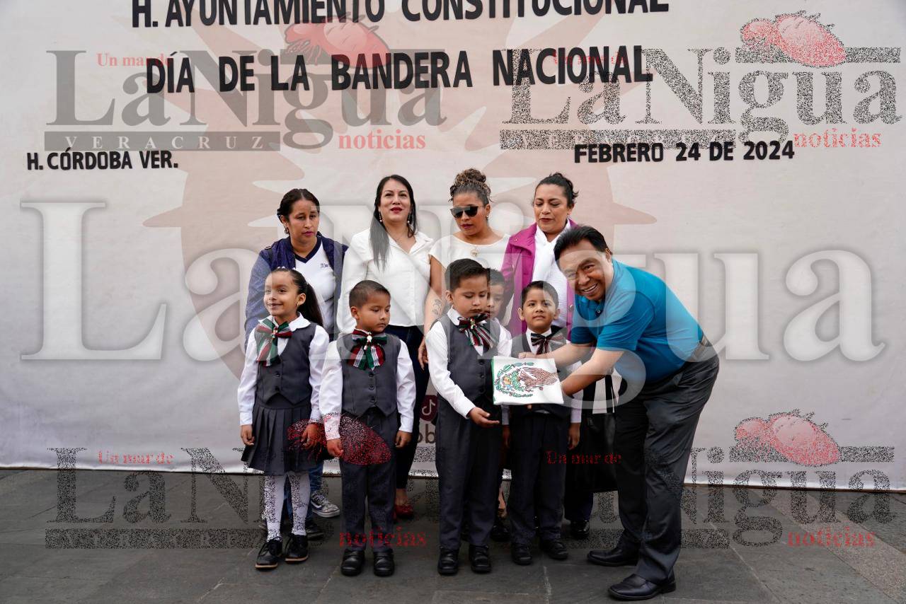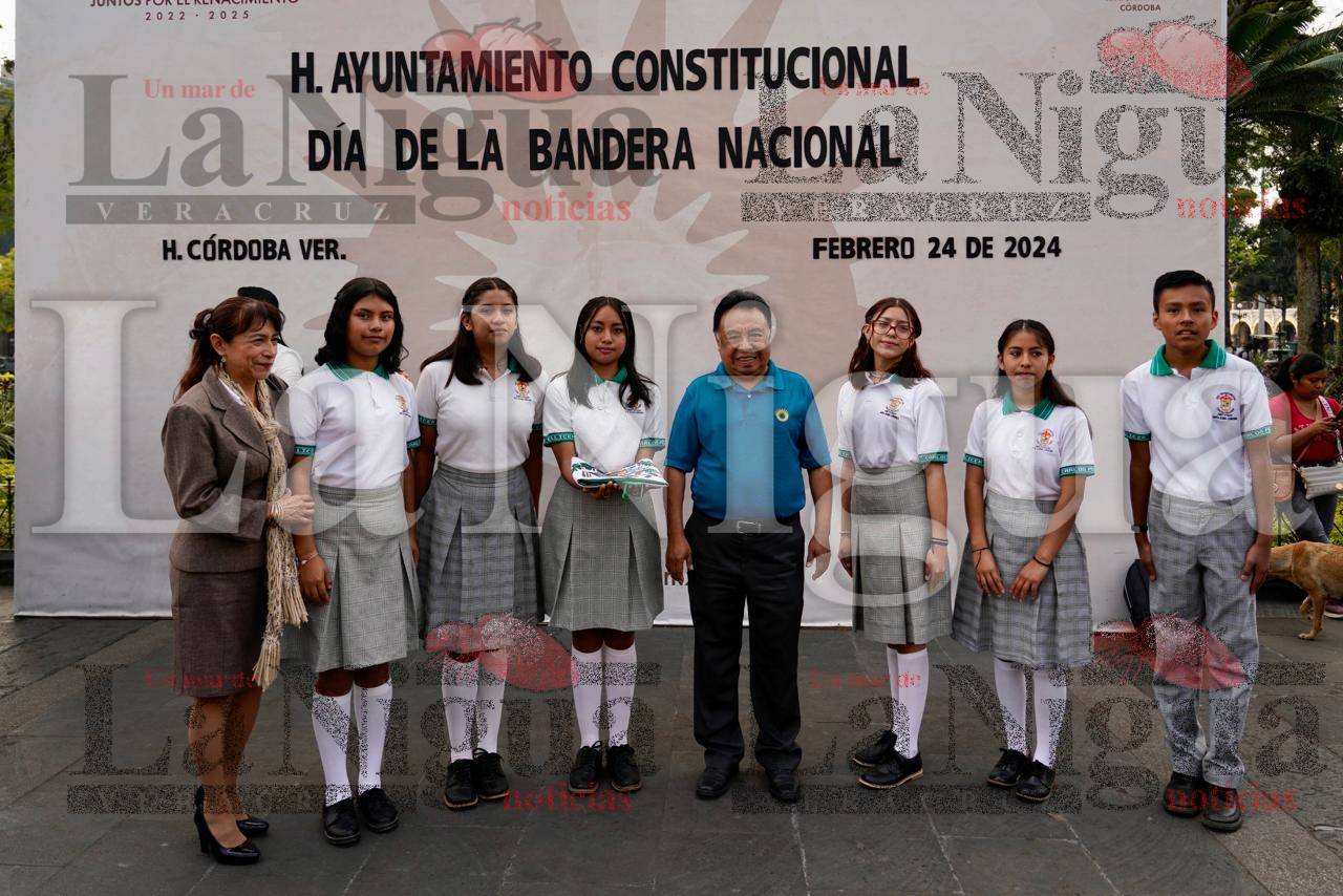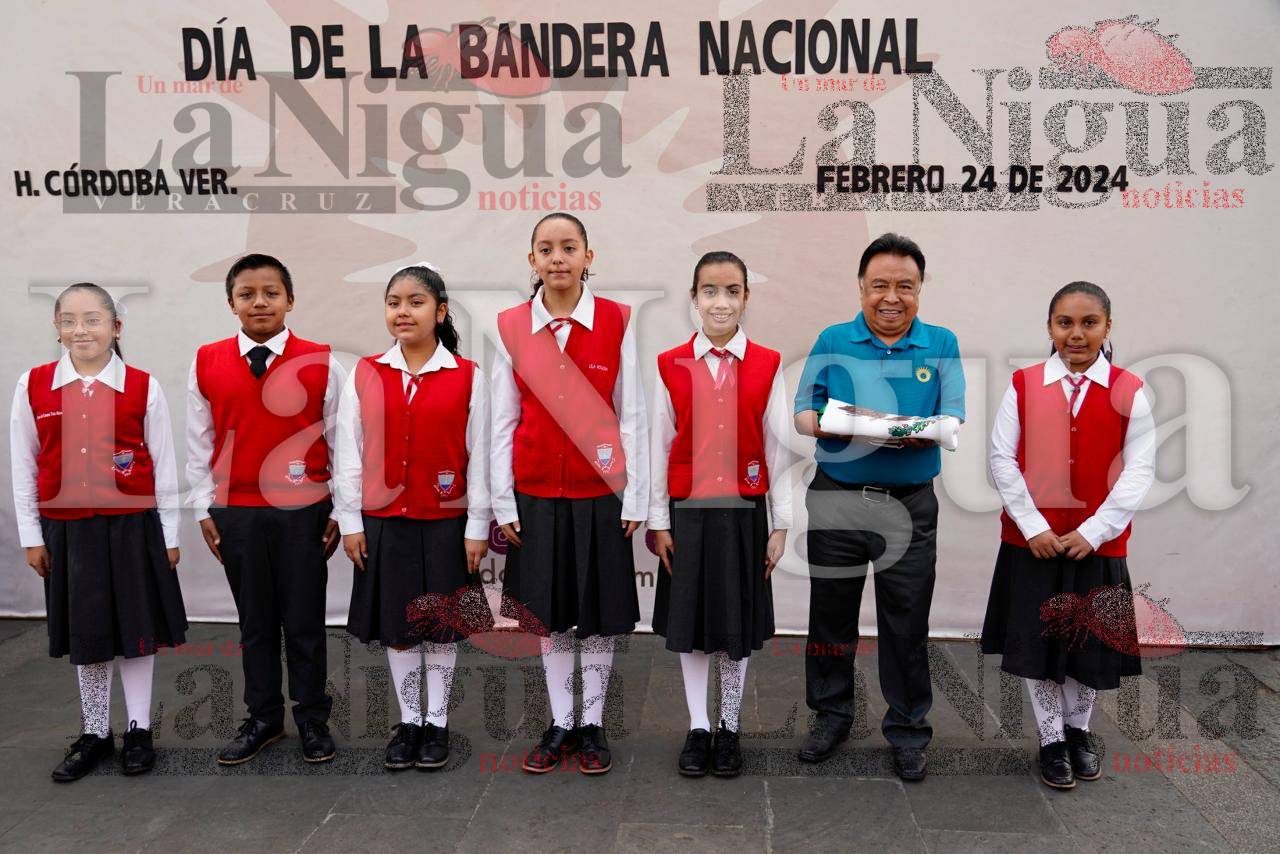 H. Córdoba, Ver. 24 de febrero del 2024. En el marco del Día de la Bandera, el alcalde de Córdoba, Juan Martínez Flores abanderó a 48 escoltas de diversas escuelas, que rindieron protesta en muestra al compromiso del respeto hacia el lábaro patrio