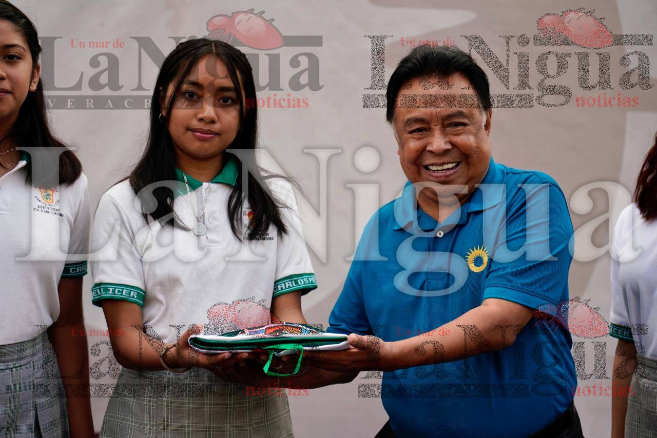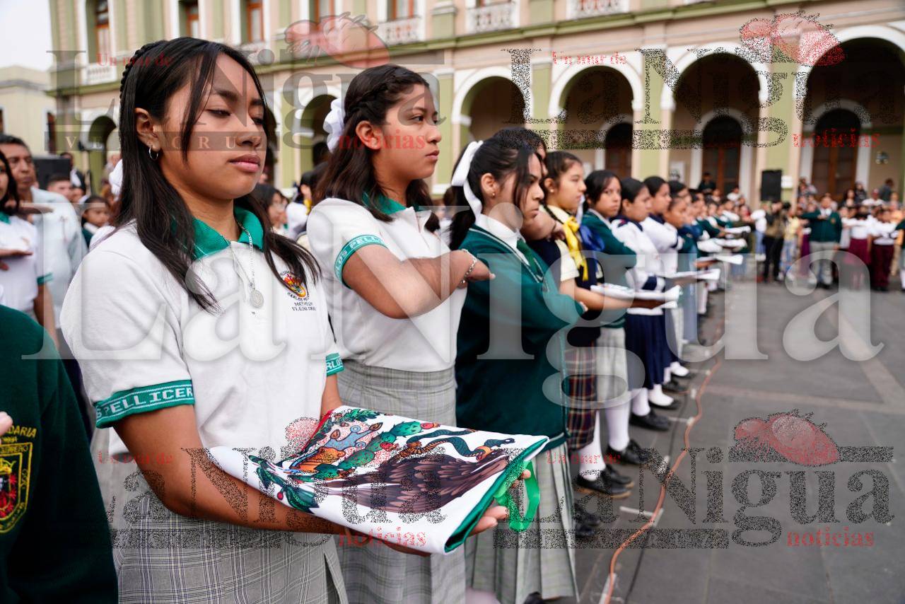 “Vengo en nombre de México a encomendar a su patriotismo, y estricta responsabilidad, está bandera que simboliza, su honor, sus instituciones y la integridad de su territorio”, señaló el munícipe.