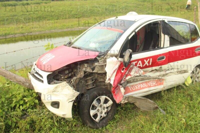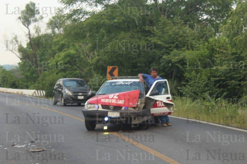 Tantoyuca, Ver.- Cuatro personas heridas, dos mujeres y dos niñas, además de cuantiosos daños materiales fue el saldo de un fuerte encontronazo sobre el tramo carretero Alazán – Canoas a la altura de la curva de San Sebastián, los protagonistas de este aparatoso accidente vehicular fueron dos taxis, el chófer responsable venía en estado inconveniente, fuerza civil el primero en llegar y la guardia nacional, división caminos se encargó de los hechos.