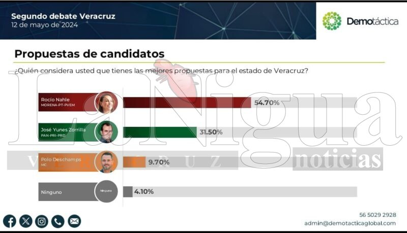 En la medición, también se considero la siguiente pregunta: ¿Quién considera usted que tiene las mejores propuestas para el estado de Veracruz?, resultando triunfante Rocío Nahle con el 54.70 por ciento, contra 31.50 del priista Pepe Yunes y 9.70 del emecista Polo Deschmps.