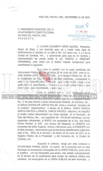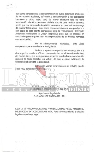 Liliana Yépez, apoderada legal de la señora Guadalupe García Millar, propietaria legal de Los Limos, acudió al ayuntamiento a denunciar que no existe derecho de contaminar para siempre el rancho, pues una vez que lo recupera la dueña, no le va a servir para nada.