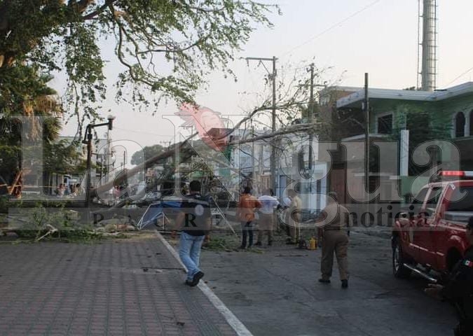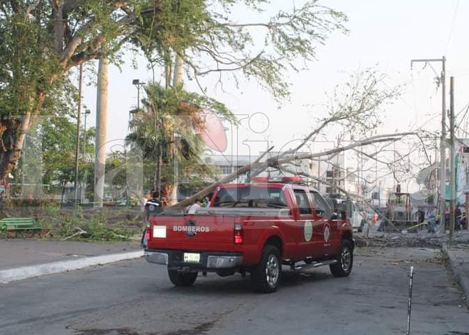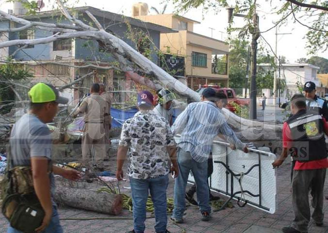 Tampico, Tamaulipas.- Intensa movilización de autoridades y cuerpos de emergencia se vivió la tarde de este miércoles en las inmediaciones de la plaza de la colonia Guadalupe Victoria conocida como “El Golfo”, al caer enorme árbol que terminó sobre unos negocios ambulantes de ropa, resultando varias mujeres lesionadas.