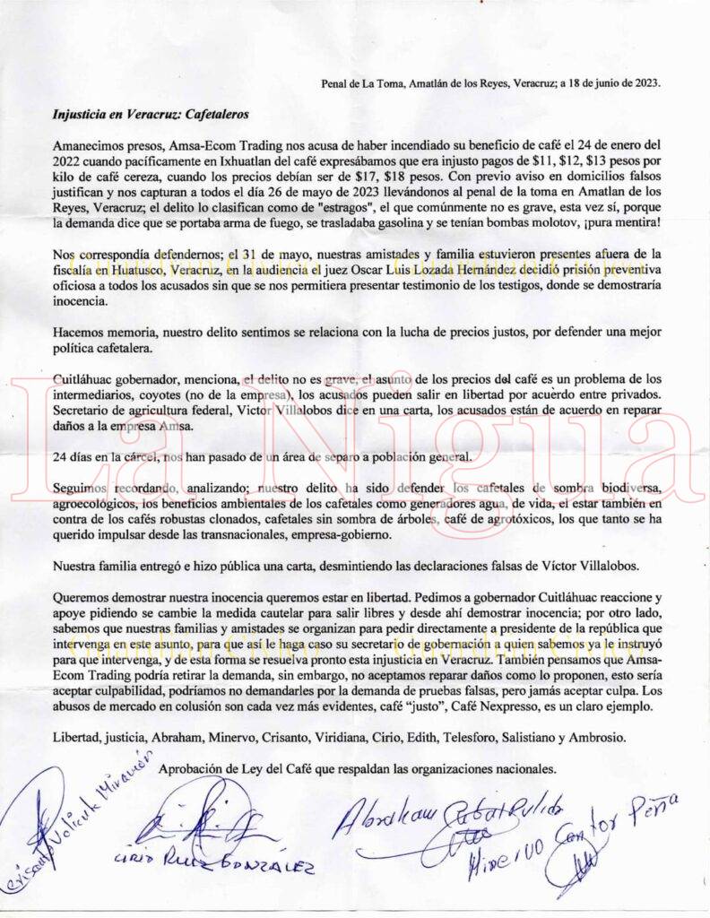 Desde el Penal de La Toma, cafetaleros escriben a la Opinión Pública que de los Separos ya los trasladaron a población de presos, luego de 24 días de haber sido privados de la libertad. La empresa AMSA los acusa de haber incendiado un área de la factoría, la noche del 22 de enero 2023ñ2