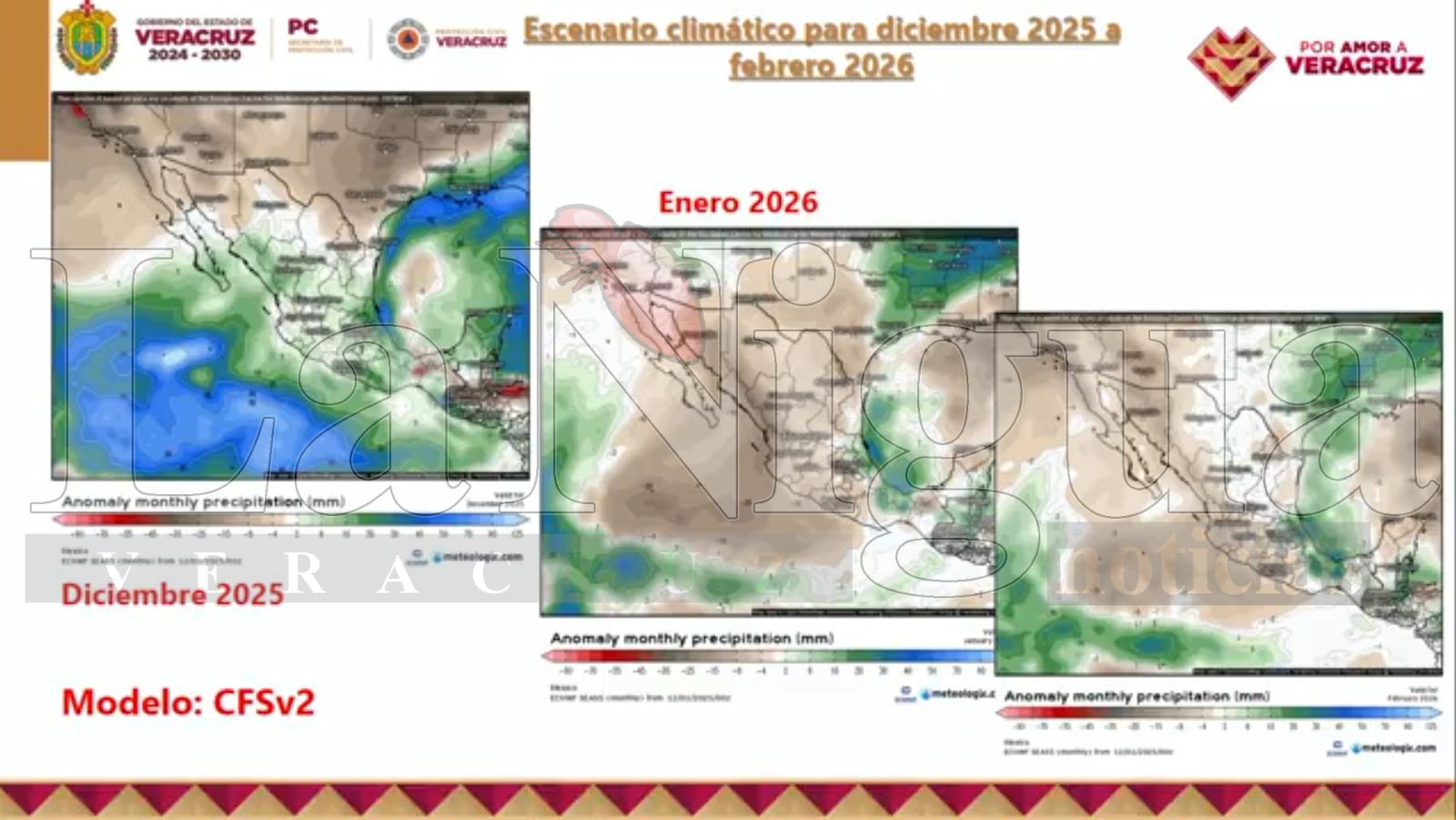 Los modelos climáticos coinciden en que este invierno podría presentar periodos importantes de frío y humedad, con posibilidad de lluvias por arriba del promedio en varias regiones de Veracruz, además de mayor frecuencia potencial de aguanieve, nieve y heladas en zonas altas, influenciado por el actual episodio débil de La Niña.