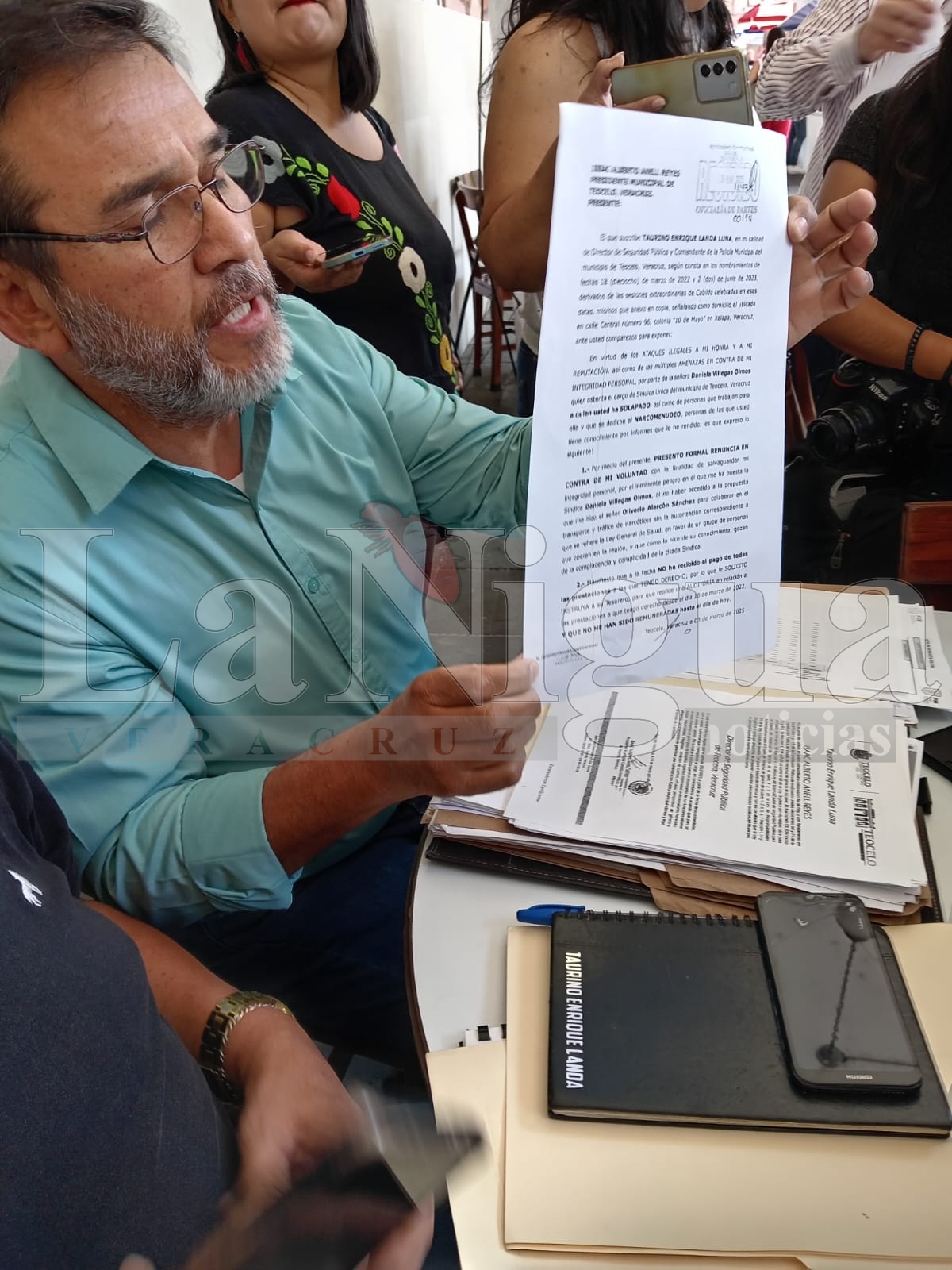 Teocelo, Ver.- Taurino Enrique Landa Luna, exdirector de Seguridad Pública y excomandante de la Policía Municipal de Teocelo, realizó una denuncia pública este jueves, acompañado de su abogado Jorge Roberto Andrade Rivas, en la que señaló haber sido víctima de amenazas y ataques a su integridad, presuntamente por parte de la síndica única del municipio, Daniela Villegas Olmos.