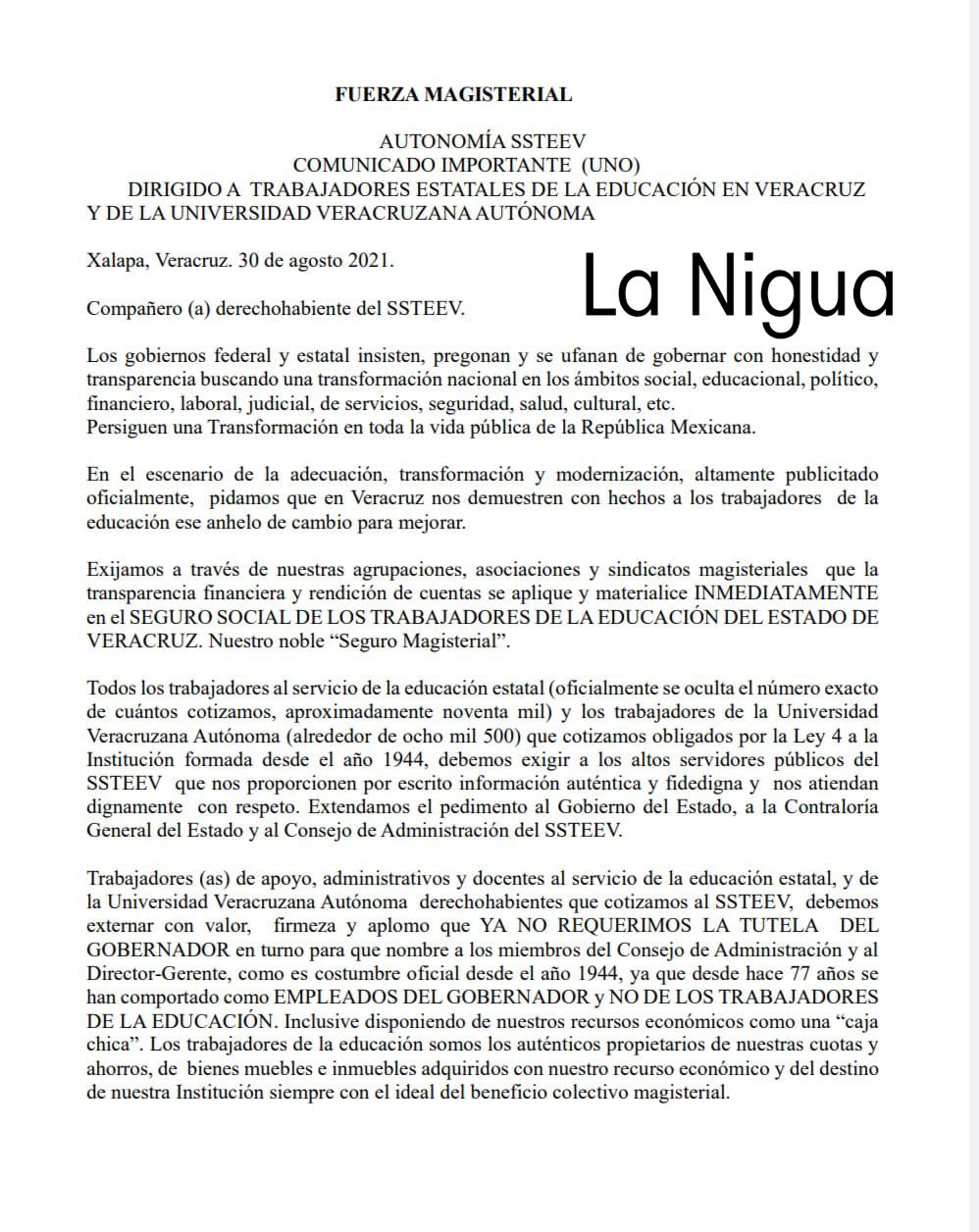 Xalapa, Ver.- El Movimiento Fuerza Magisterial exigió practicar una auditoría financiera el Seguro Social de los Trabajadores de la Educación del Estado de Veracruz (SSTEEV) para conocer el estado actual de la reserva técnica de la institución, producto de las aportaciones de los trabajadores y que hasta el 2019 sumara casi 50 millones de pesos, en un comunicado dirigido a los trabajadores de la educación y de la Universidad Veracruzana (UV), la organización magisterial realizó esta exigencia derivada porque el actual Director-Gerente Francisco Enrique Pérez Carreón ha mostrado indolencia, opacidad institucional o perversa mentira manipuladora.