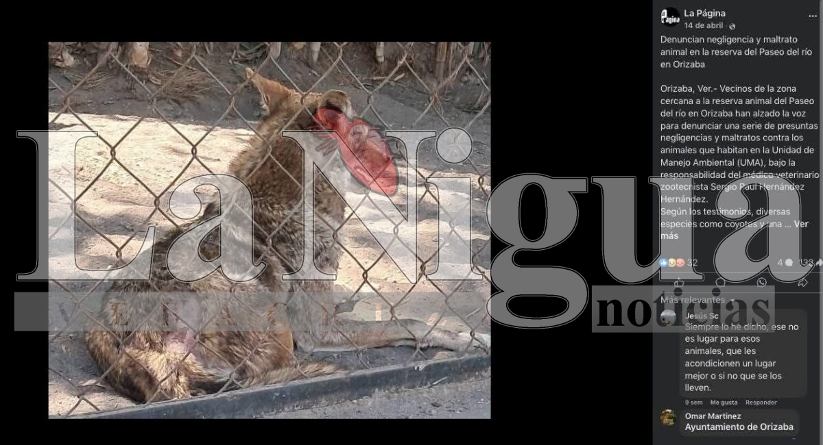Orizaba, Ver. — Tras la muerte de un león en cautiverio en el Paseo del Río de Orizaba, un comunicado de denuncia responsabilizó al Ayuntamiento de manipular la información y de mantener a los animales en condiciones inadecuadas.
