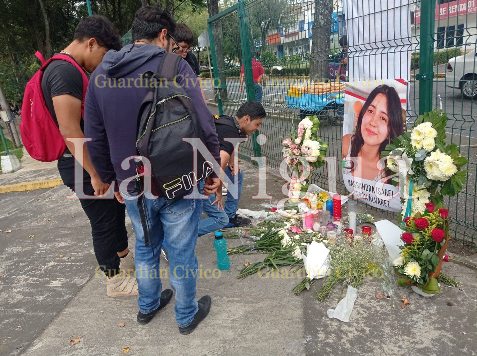 Los estudiantes portan en sus manos varias cartulinas donde piden justicia para la compañera Casandra Isabel Cerón Álvarez, así también en donde ella cayó después del golpe se encuentra una foto con el rostro de ella y a su alrededor arreglos florales y veladoras.