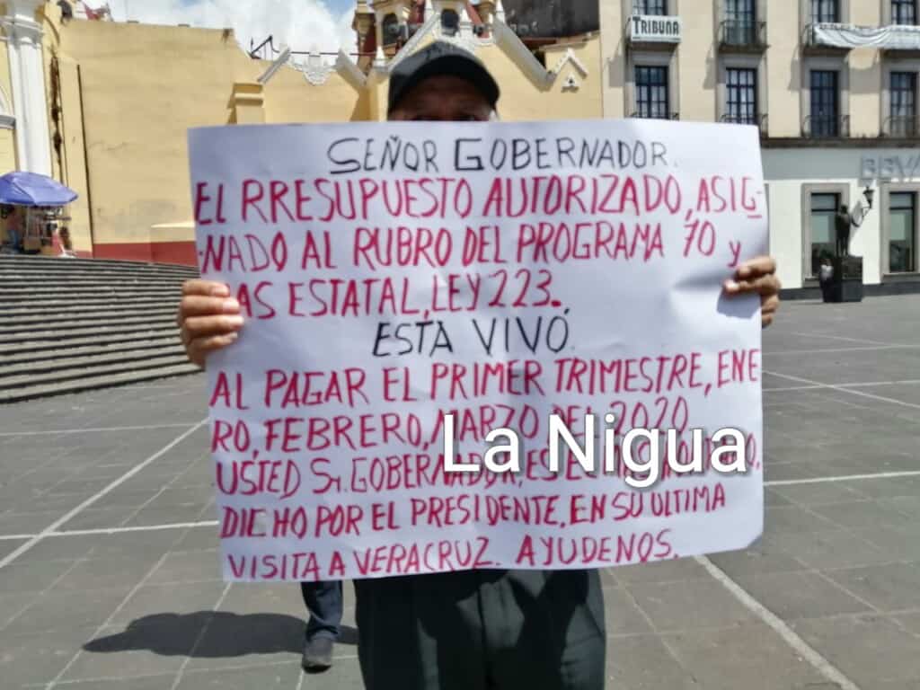 Xalapa, Ver.- Un pequeño grupo de integrantes de la Alianza de Jubilados, Pensionados y Adultos Mayores de Xalapa, se manifestaron en la plaza Lerdo, para exigirle al gobierno del Estado que les pague el segundo trimestre del programa ” 70 y más”, los diputados locales aprobaron la ley 223 con una votación de 34 a favor y 14 en contra, promovido por Morena, se les fueron los pies ya que pagaron el primer bimestre de este año 2020 de los meses Enero, Febrero y Marzo, el presupuesto se aprueba anual, “Ahora exiguimos que se nos pague el segúndo trimestre de los meses de Mayo, Junio y Julio, ya estamos en agosto y no hemos recibido nuestro pago”, así lo manifestó el presidente de esta alianza, Pablo Hernández Jiménez.