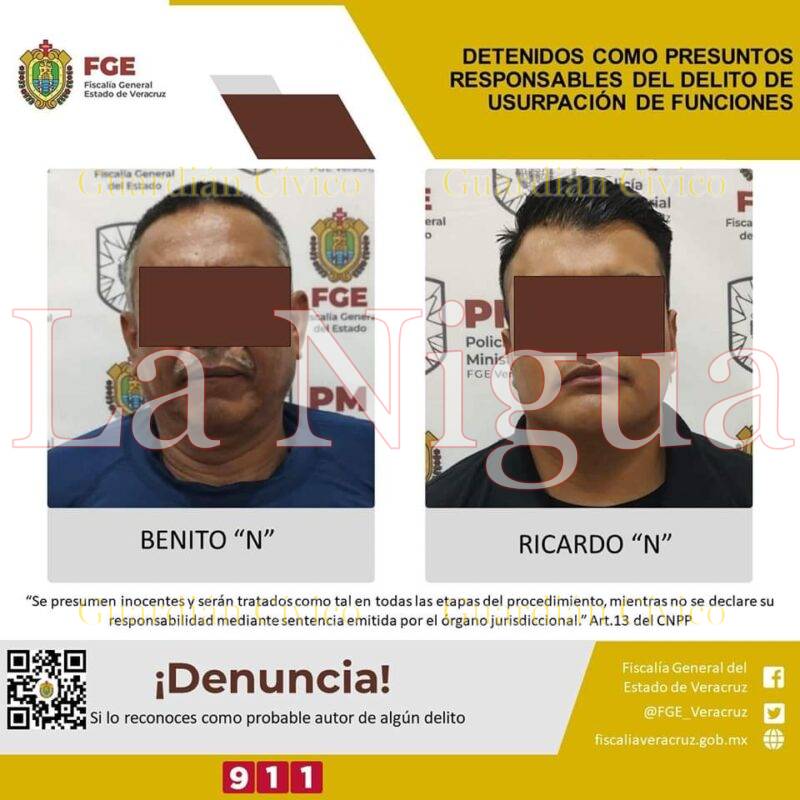 Córdoba, Ver., 21 de septiembre 2023.- Elementos de la Policía Ministerial realizaron la detención en flagrancia de Ricardo “N” y Benito “N” como presuntos responsables del delito de usurpación de funciones.