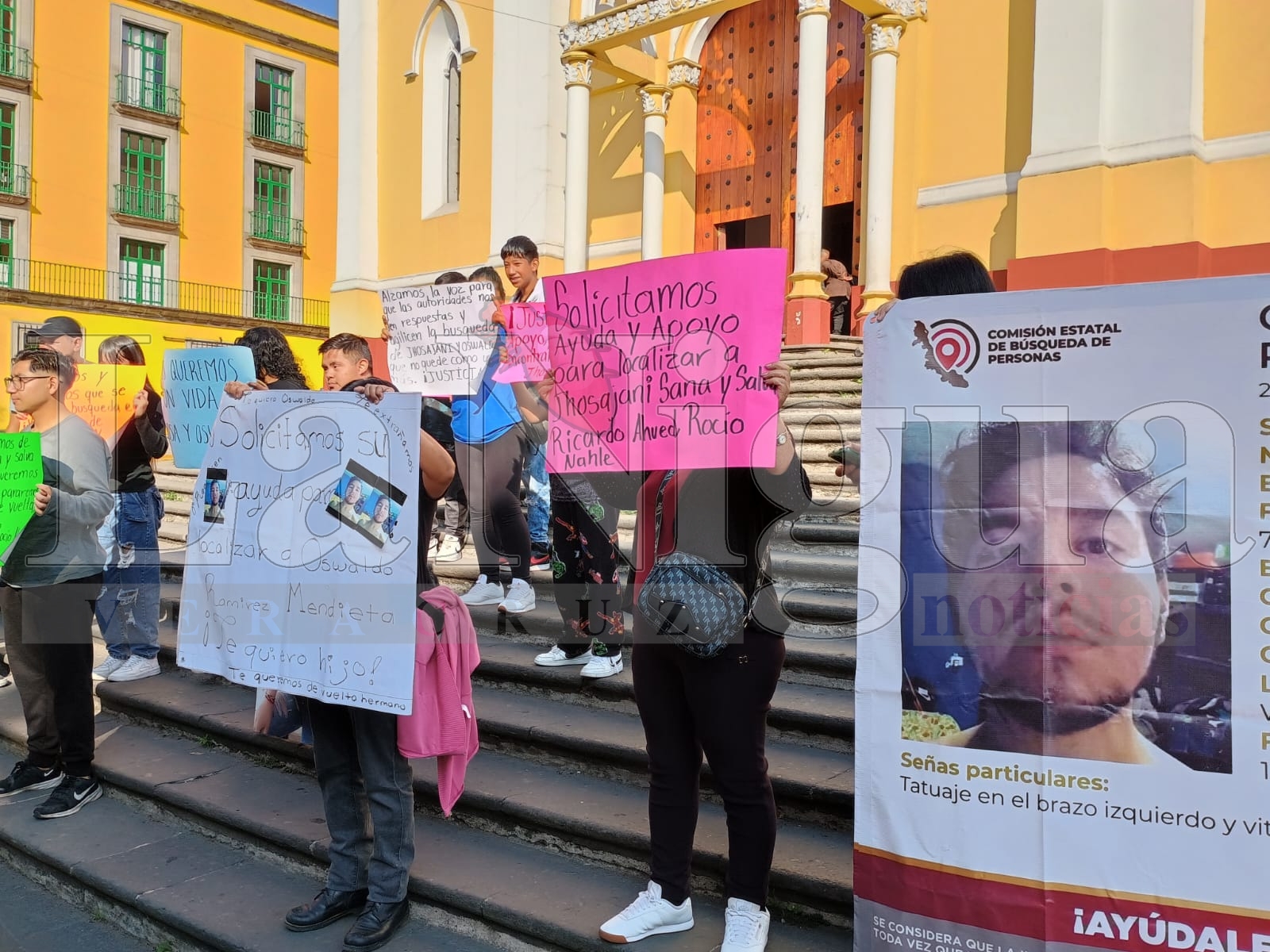 Durante la protesta, los familiares portaban cartulinas y lonas con los rostros de los jóvenes, exigiendo su pronta localización y que no se deje de difundir el boletín de búsqueda.