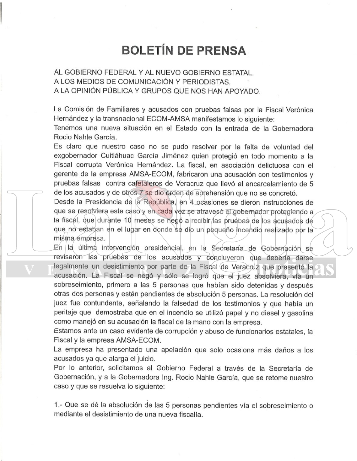 Ixhuatlán del Café, Veracruz, 3 de diciembre de 2024 – La Comisión de Familiares y Acusados, implicados en un caso de pruebas falsas fabricadas por la fiscal Verónica Hernández y la empresa transnacional ECOM-AMSA, emitió un contundente boletín exigiendo justicia y señalando graves irregularidades en el proceso judicial.