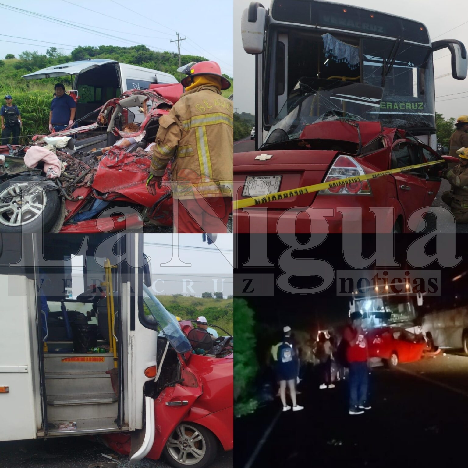 Los hechos ocurrieron alrededor de las 5:30 de la mañana a la altura de la localidad de Arbolillo, donde un autobús de la línea Sotavento invadió carril e impactó a un automóvil Chevrolet Aveo color rojo con placas YJW-499-B.