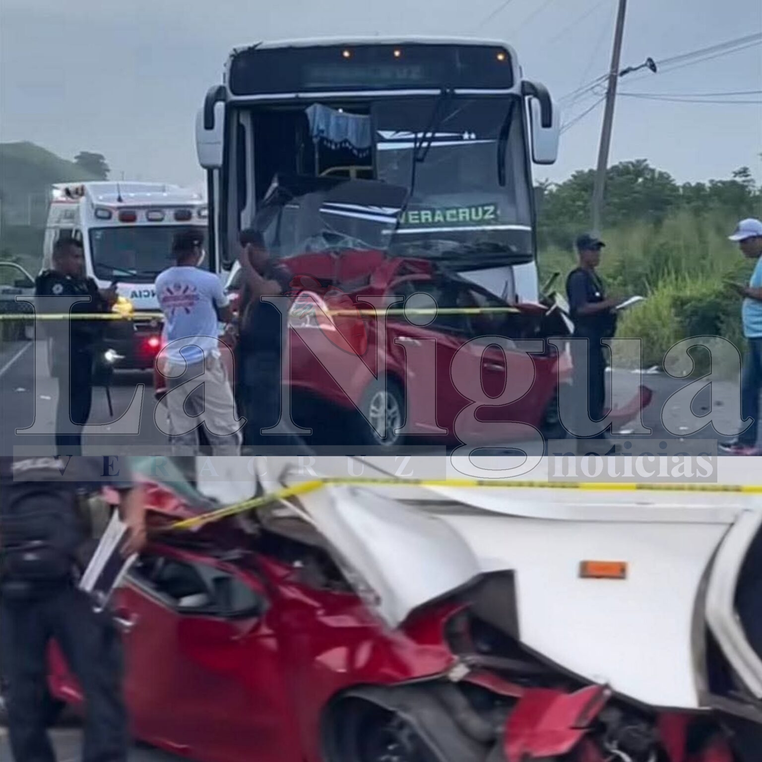 El percance involucró a un autobús de pasajeros de la línea Sotavento, que se dirigía al puerto de Veracruz, y un automóvil particular Aveo rojo, el cual terminó debajo de la unidad de transporte, según muestran imágenes del lugar.