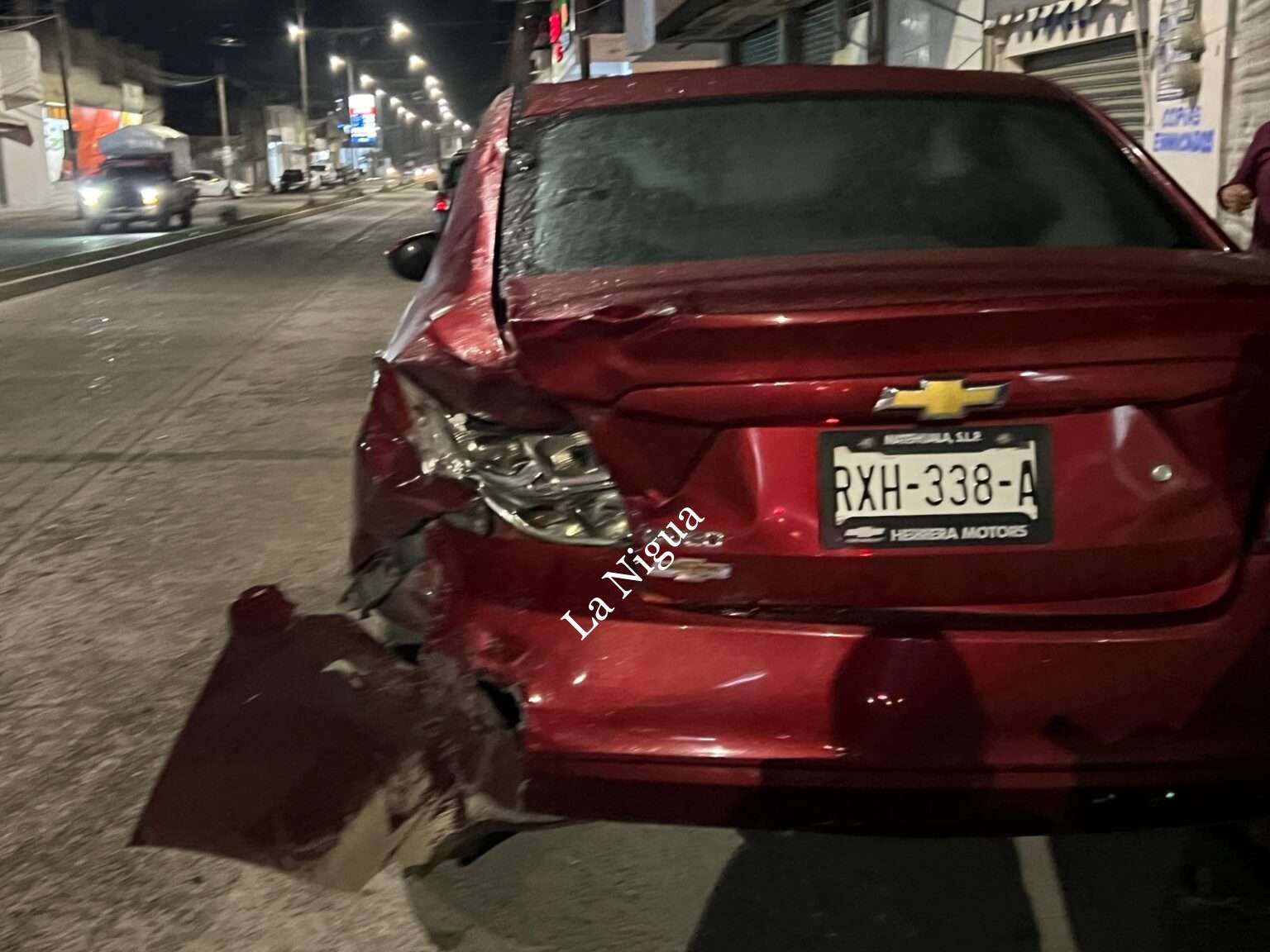 La unidad contra se impactaron, los jovencitos, resultó ser un CHEVROLET AVEO con color rojo y placas de circulación RXH-338-A del Estado de Veracruz, quedando destrozado en su parte trasera, debido al fuerte impostor por parte de los ocupantes de la motocicleta colisionada.