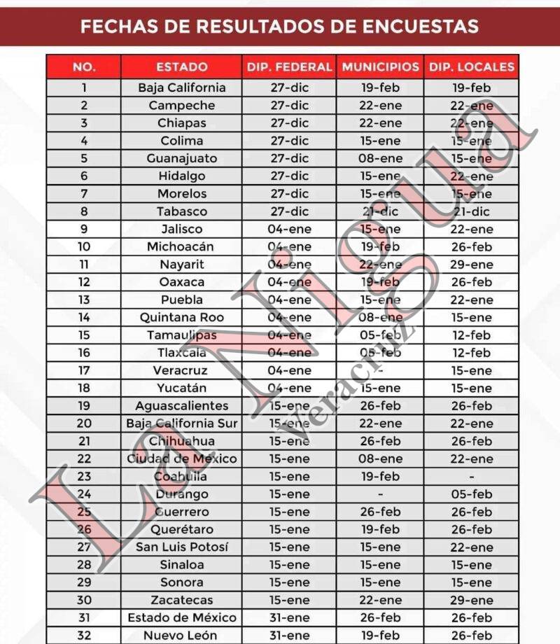 CdMx.- El partido Morena dio a conocer las fechas para publicar los resultados se sus encuestas a congresos federal, locales y alcaldías a elegir en 2024.