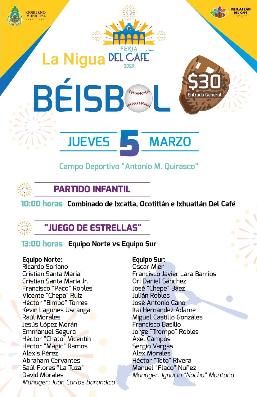 Llegó la hora, ya en plena feria en Ixhuatlán del Café, éste jueves se llevará a cabo el Juego de Estrellas del beisbol, con dos equipos divididos en Zona Norte y Zona Sur, con los mejores peloteros de la región.