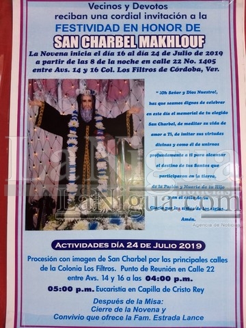 [vc_row][vc_column][vc_column_text]Córdoba, Ver.- 11/07/19 Evento religioso en honor a San Charbel, dará inicio el día 16 de julio, a partir de las 8 de la noche en la calle 22, número 1405, entre av. 14 y 16, Colonia Los Filtros, finaliza el día 24 de julio con una procesión con la imagen, por las principales calles de la colonia.