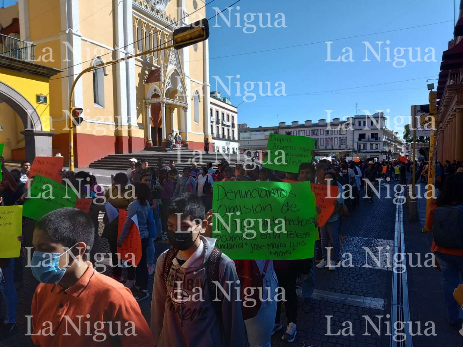 Xalapa, Ver.- Integrantes de la Federación Nacional de Estudiantes Revolucionarios “Rafael Ramírez” (FNERRR), se manifestaron en la Plaza Lerdo, para pedirle a la Secretaría de Gobierno que intervenga para que de solución a los problemas que se están pasando en la escuela Telesecundaria ” José María Luis Mora”, ubicada en la colonia Miguel Alemán de esta ciudad de Xalapa, este plantel educativo tiene 20 años de su fundación y jamás se habían tenido problemas, pero a finales del mes de octubre del año pasado y a la fecha ha sufrido, saqueo, acoso, y vandalismo, a pesar de que ya se realizó la denuncia ante la fiscalía general del estado de Veracruz (FGE), y se ha señalado a la persona que ha hecho este vandalismo, no ha hecho nada por resolver el problema que han sufrido los estudiantes, docentes y padres de familia, así lo manifestó, Juventino Navarrete, dirigente del movimiento antorchistas en esta ciudad de Xalapa.