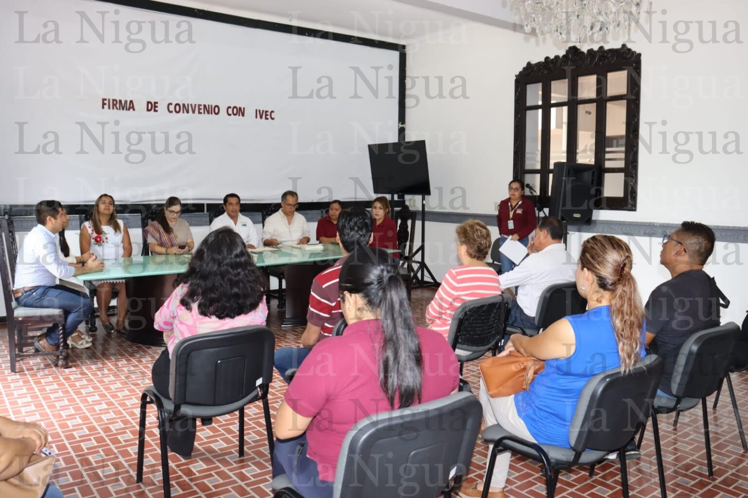 Cabe señalar que esta firma de convenio de colaboración con el IVEC estuvo a cargo de la sindica única Elisabeth Navarro Ginez, del presidente municipal Gerardo Rosales Victoria y la directora general del IVEC, Silvia Alejandre Prado.