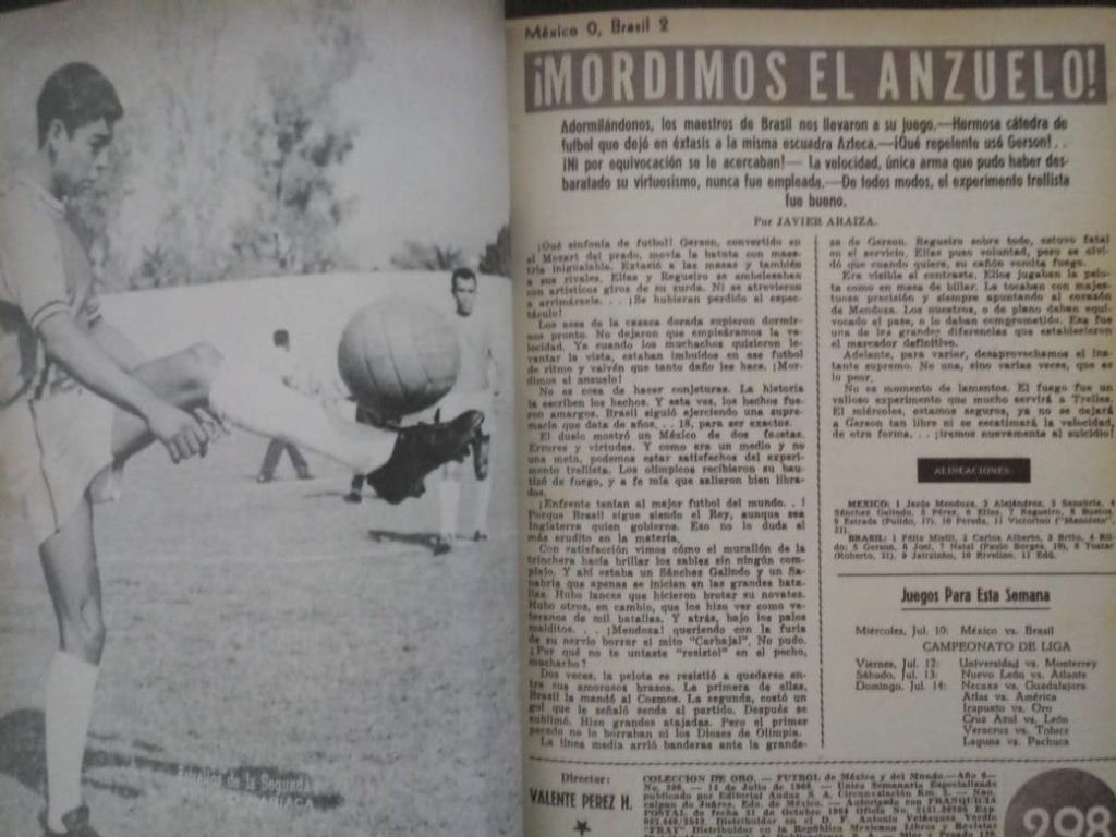 La crónica de Javier Araiza, de aquel mes de julio de 1968, dice: Mordimos el anzuelo, adormilándonos, los maestros de Brasil nos llevaron a su juego, Hermosa cátedra de fútbol que dejó en éxtasis a la misma escuadra Azteca.