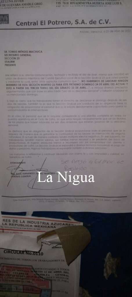 La empresa responde al Secretario General Tomas Méndez Machuca, que si bien es cierto que los trabajadores tienen derecho de descansar el domingo después de 6 días de labores, también es cierto que la Sección 23 tiene la obligación se proporcionar el personal que se le solicite para no interrumpir la industria y enfatiza ” el actuar de manera contraria tendrá múltiples efectos negativos, los trabajadores tendrán menos salarios, sus familias menos recursos y se perderá el Bono de Productividad. El ingenio producirá menos menos e incumplirá con sus compromisos con clientes y productores de caña. La Sección 23 se expondrá a diversos reclamos, incluyendo el pago de daños y perjuicios. Algunos trabajadores se expondrán a diversas sanciones. Lo invitamos a reflexionar y continuar laborando con buena fe y con intensidad y calidad en beneficio de todos”.