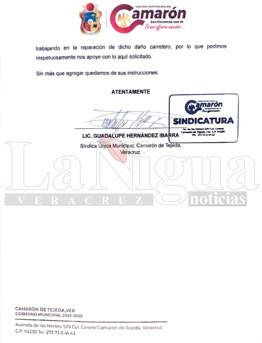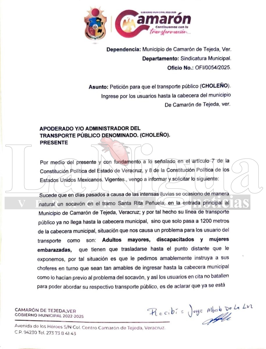 A toda la ciudadanía y usuarios del transporte público les queremos informar que por medio de la Sindicatura Municipal de este Gobierno Municipal de Camarón de Tejeda ya se realizó la petición a la línea de transporte público de autobuses “choleños” solicitando que el servicio de autobuses ingrese por los usuarios al centro de esta cabecera municipal ya que en este momento tienen que trasladarse cerca de 1.2 km a la parada más cercana en Paso del Cristo. 👇🏻 Les compartimos el oficio emitido como evidencia de la gestión y petición del servicio.