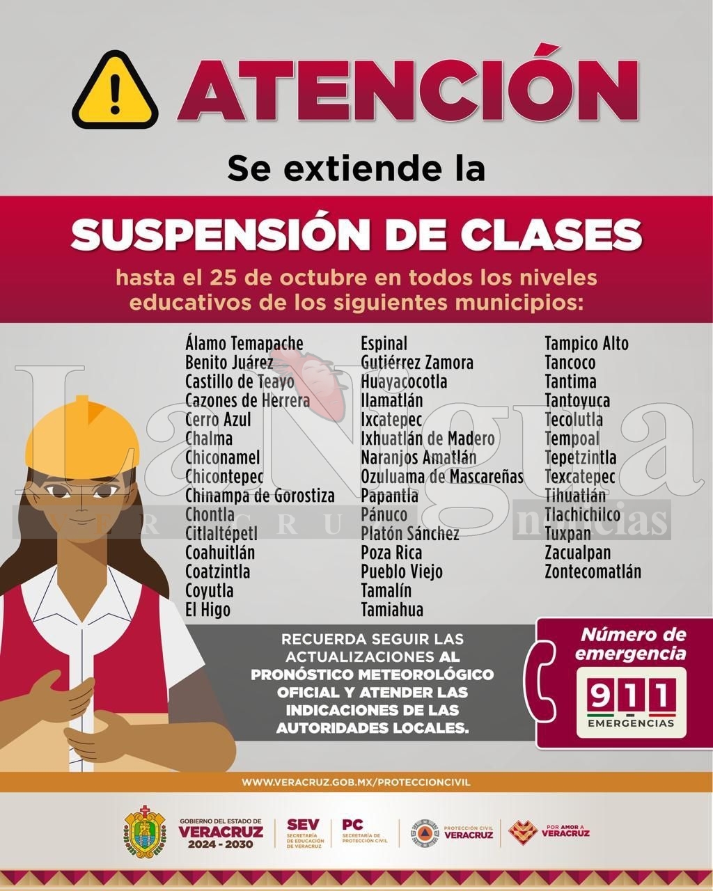 Xalapa, Ver., sábado 18 de octubre de 2025.- Por los trabajos de recuperación en la zona norte, el Comité Estatal de Emergencias, en coordinación con la Secretaría de Educación de Veracruz, informa que se extiende la suspension de clases y actividades escolares en 43 municipios hasta el sábado 25 de octubre: