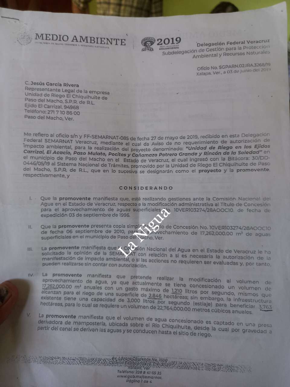Carrizal, Paso del Macho, Ver.-La Unión de riego el Chiquihuite originaria y establecida en Paso Del Macho, concretamente ubicada en el Ejido Carrizal culminó recientemente la concesión de agua de un permiso que tenía por 25 años, sin embargo, eso no es obstáculo para seguir trabajando, dice don Jesús García Rivera presidente de esta Unión de Riego, que dirige junto a don Hipólito Hernández Carranza y don Julio Felipe García Hernández.