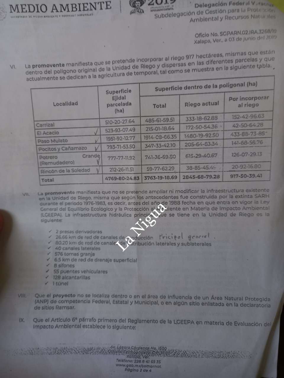 Debido a que no hay un padrón requisitado ante Conagua, la unidad de riego se ha visto en la necesidad de acercarse a PROSEDE para que estos estudios de Impacto Ambiental se realicen. Los estudios se basaron en monitorear el aforo durante un año, en ese lapso de tiempo se contabilizaron los riegos que disminuyen en un año dando un total hasta de 60 riegos que se secan, se concluyó que con la infraestructura actual del canal para proveer una sola hectárea se requiere un tiempo de 12 horas, con un promedio de 25 litros por segundo, el río abastece de agua al canal con la totalidad de 2000 litros por segundo, aún después de esto, la unidad se ve obligada a dejar un 10 por ciento de agua en el río para no explotar todo el caudal y evitar así el riesgo de multas federales y estatales así como de daño ambiental. Con este tipo de gestiones CONAGUA otorgó una parte de presupuesto del que se necesita para terminar de construir con concreto hidráulico el canal de riego que abarca casi 18 kilómetros, cabe mencionar que con este proyecto la Comisión Nacional de Agua Potable reconocerá las 963 hectáreas faltantes ya que solo reconoce 2800.