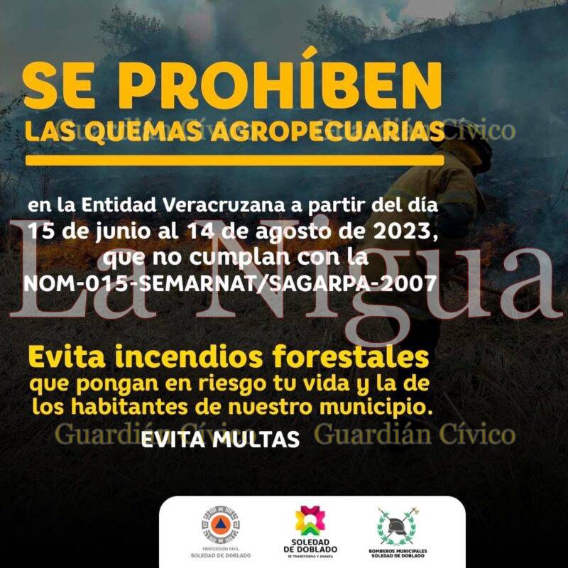 Con el fin de evitar estos incendios, el H. Ayuntamiento informa que se dará cumplimiento al decreto por el que se prohíben las quemas agropecuarias en la entidad Veracruzana que no cumpla con las condiciones generales establecidas en la NOM-015-SEMARNAT/SAGARPA-2007.