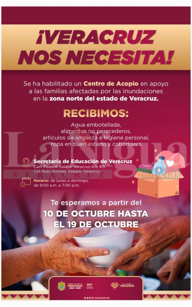 Xalapa, Ver., 10 de octubre de 2025.– A partir de este viernes, la Secretaría de Educación de Veracruz (SEV) habilitó un Centro de Acopio en sus oficinas centrales, ubicadas en el kilómetro 4.5 de la colonia Rubí Ánimas, en esta ciudad capital, con el objetivo de apoyar a las familias damnificadas por las recientes inundaciones registradas en la zona norte del estado.