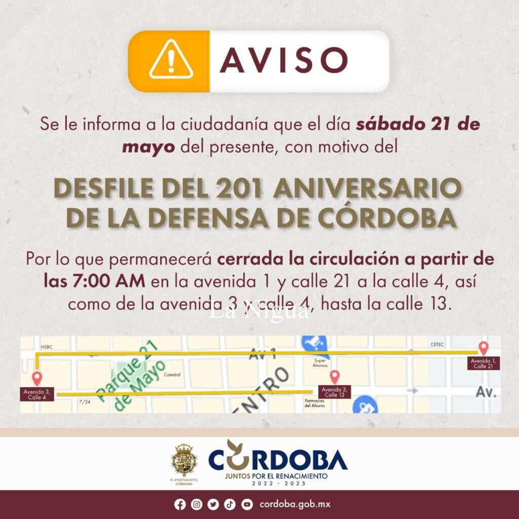 Córdoba, Ver., (20 de mayo de 2022).- Con motivo de las actividades cívicas y deportivas a desarrollarse este fin de semana, el Ayuntamiento de Córdoba informa a la ciudadanía sobre el cierre parcial en las principales vías del centro por el desfile del “201 Aniversario de la Defensa de Córdoba”, y el maratón Bicentenario a realizarse el domingo 22 de mayo.