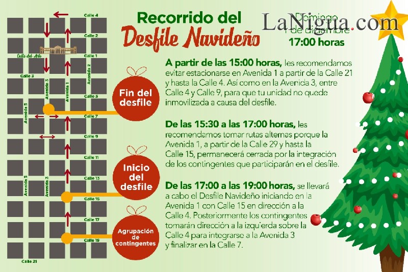 Esto para que de 5 a 7 de la tarde se lleve a cabo el Desfile Navideño iniciando en la Avenida 1 y Calle 15 en dirección a la Calle 4, posteriormente los contingentes tomarán dirección a la izquierda sobre la Calle 4 para integrarse a la Avenida 3 y finalizar su recorrido en la Calle 7.