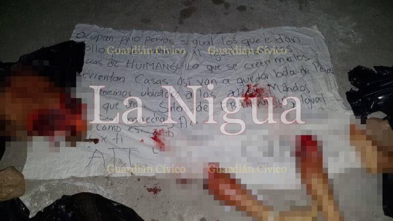 Los cuerpos desmembrados estaban sobre el suelo a un lado de la carretera federal a la altura del restaurante “Cielito Lindo”, frente a una casa abandonada donde se encontraba la carrocería de una camioneta Nissan, color blanca, debajo de los restos humanos una lona donde se escribió un texto con tinta negra en contra de autoridades de seguridad del municipio.