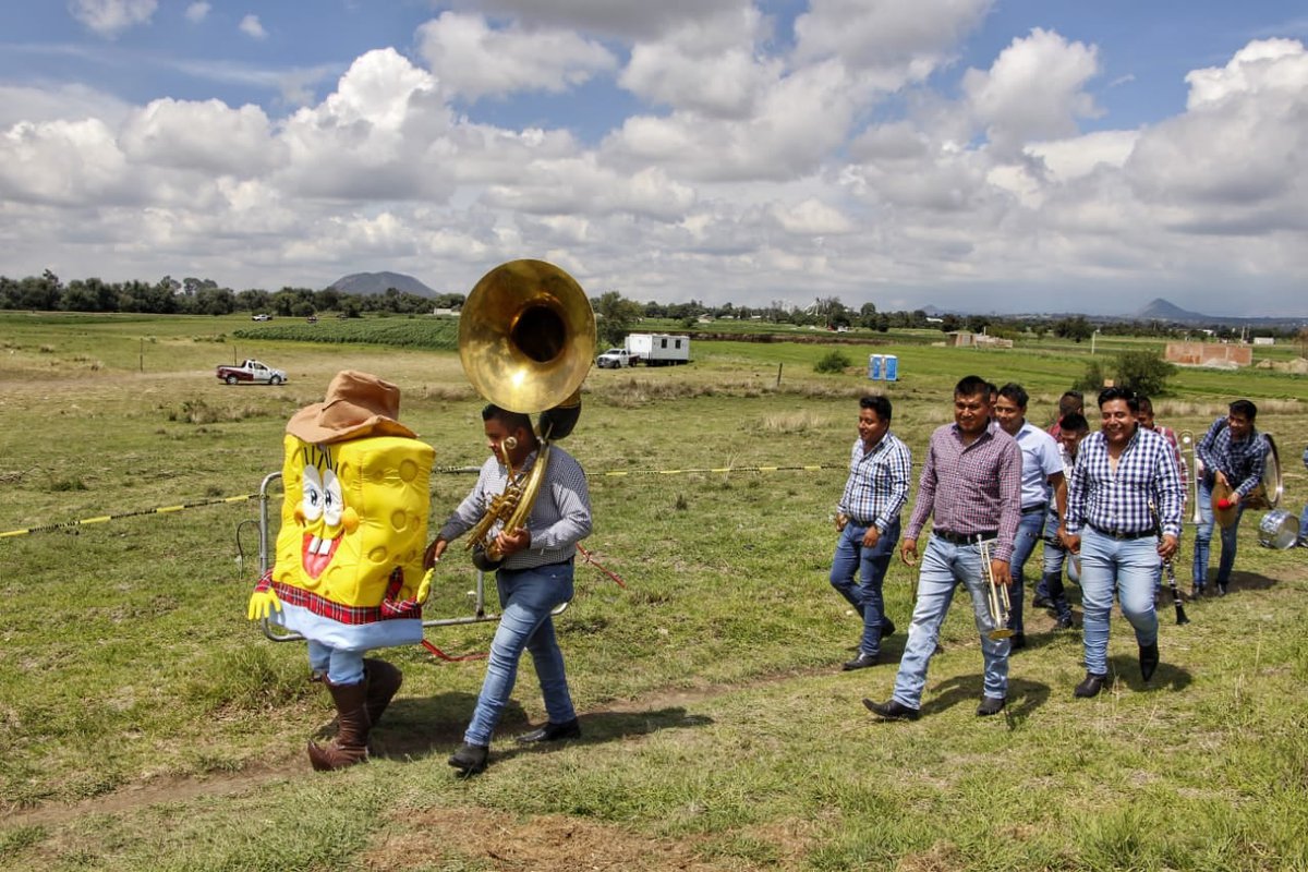 Un grupo musical llamado Banda Vientos del Sur soprendió a usuarios de redes sociales tras compartir un video y varias imágenes en donde se les ve filmando un videoclip en pleno socavón de Puebla y con una llamativa botarga de Bob Esponja.