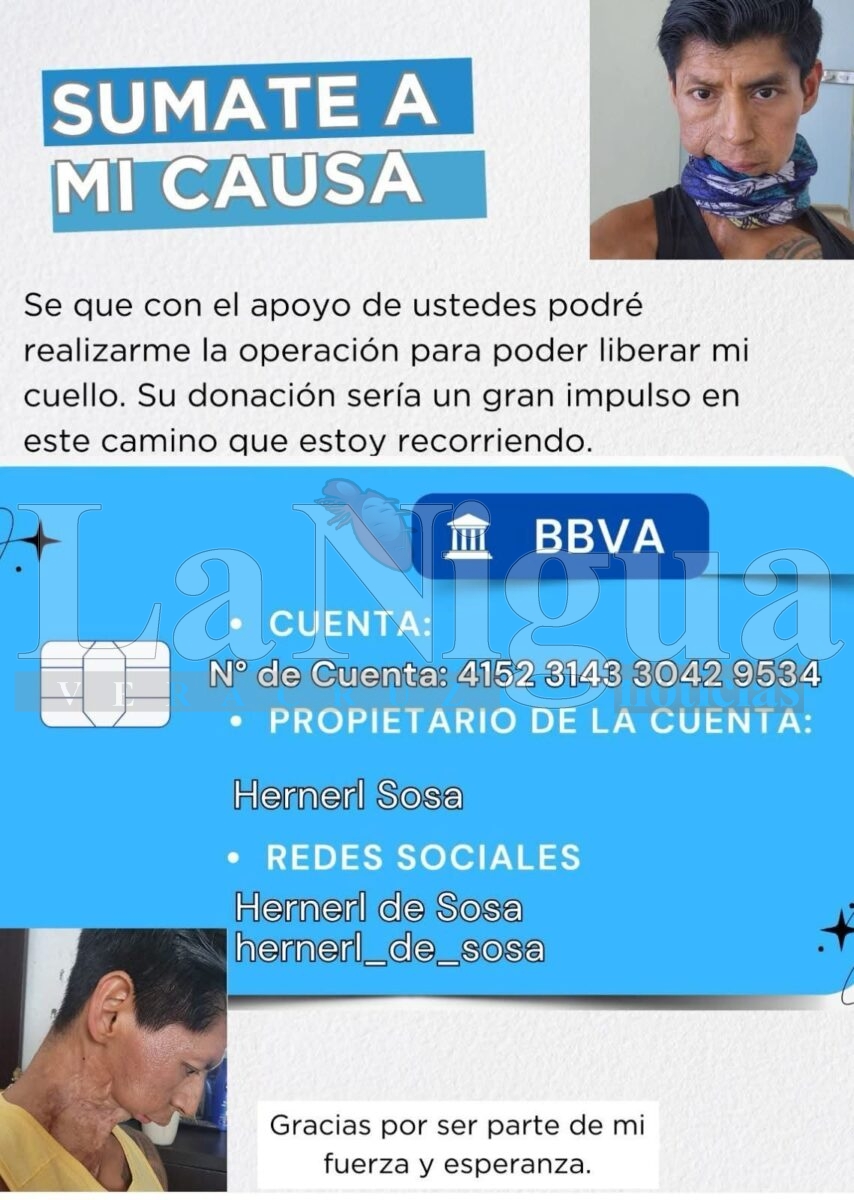 Puso a disposición el número de cuenta 4152 3143 3042 9534 para quien pueda apoyarlo. Para más información pueden seguirlo en sus redes sociales de Facebook @HerneldeSosa y de Instagram @Hernerl_de_Sosa.