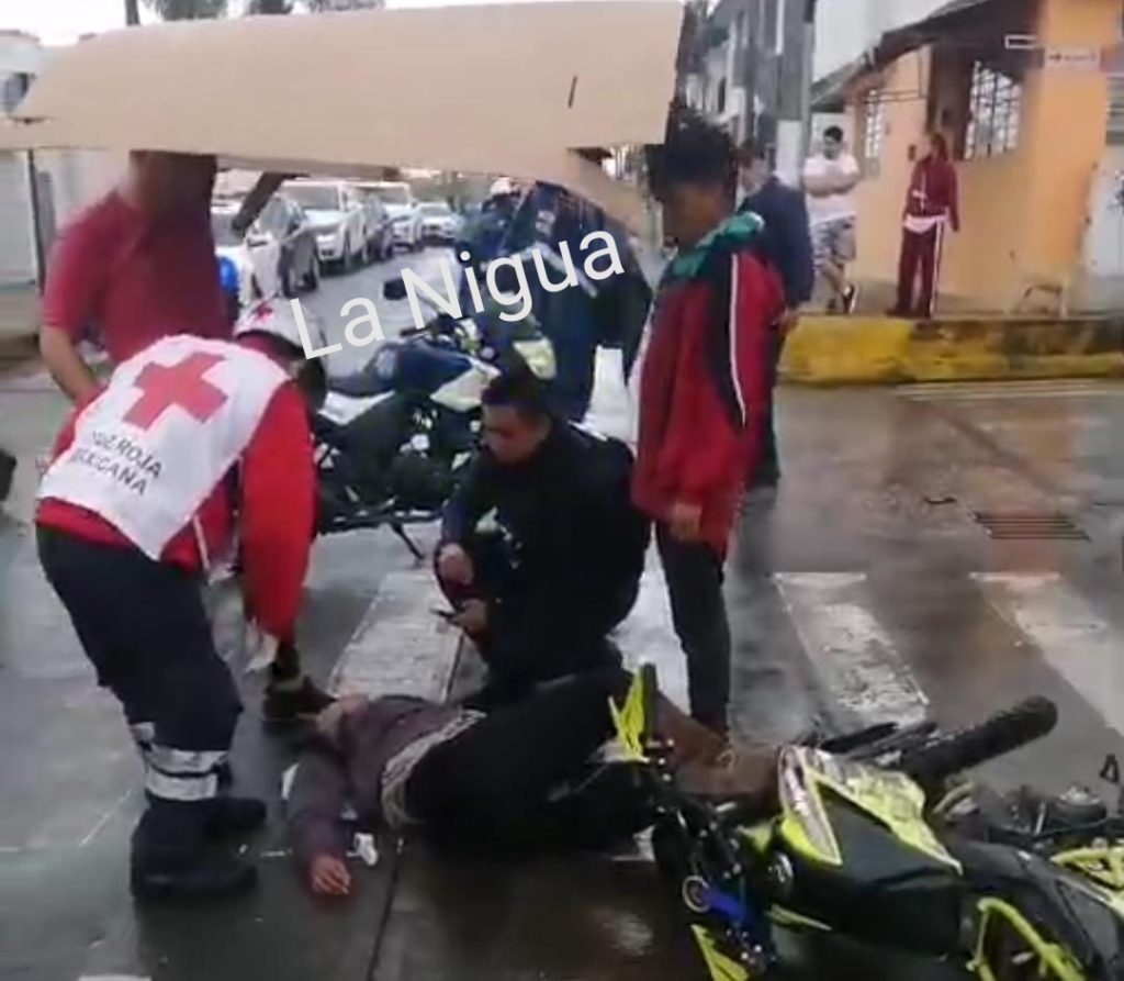 El percance se registró cuando transitaba sobre la calle 6, una motocicleta Italika color amarilla con negro, en el que viajaba un hombre y una mujer.