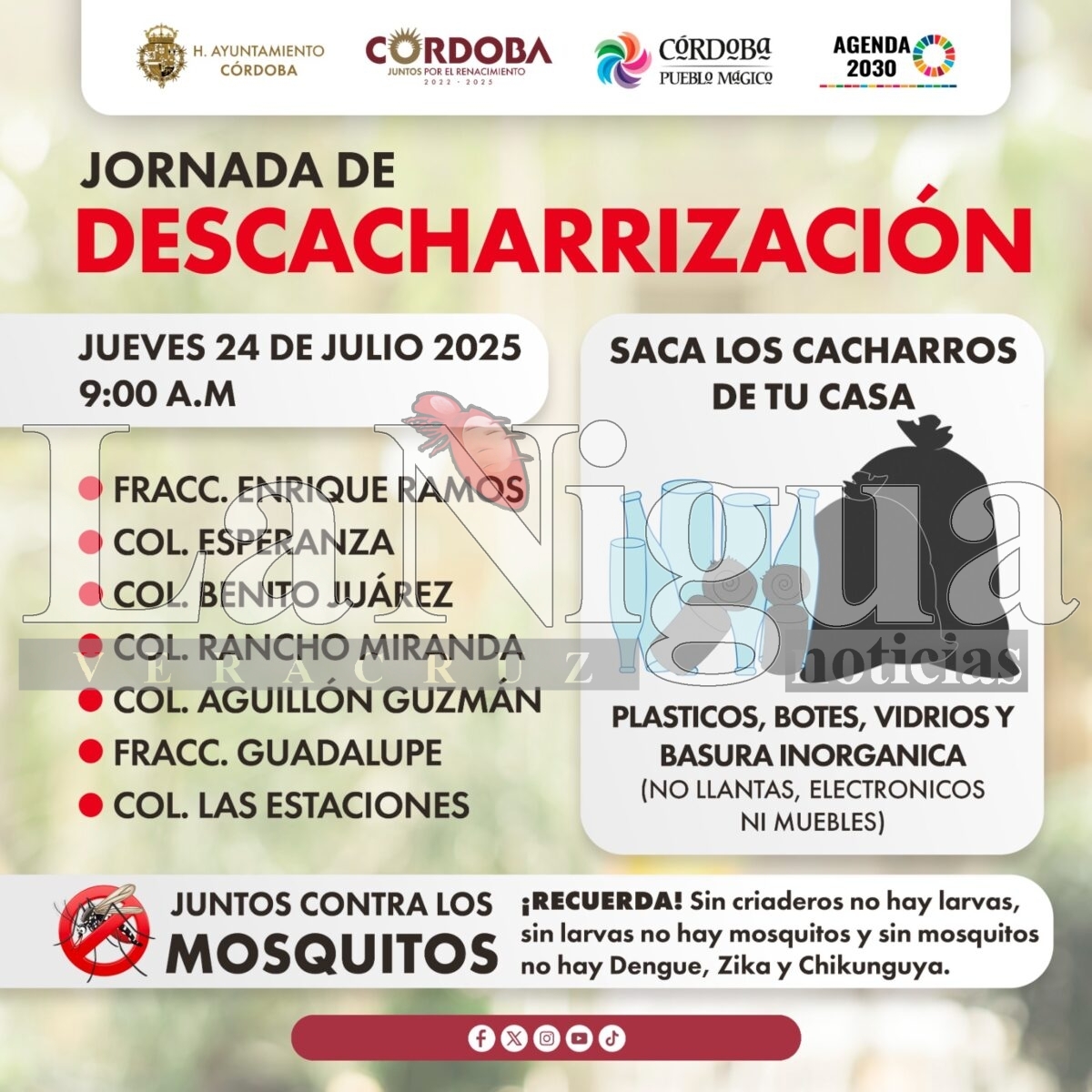 Córdoba, Ver., 21 de julio de 2025.- Cuidando la salud de la población, el Ayuntamiento de Córdoba y la Jurisdicción Sanitaria número 6 implementará acciones preventivas para la eliminación de criaderos de mosco transmisor del Dengue como objetos y recipientes que almacenen agua esto no incluye llantas, electrónicos, ni muebles. Se hace el llamado a los vecinos de las colonias Esperanza y San Pedro, así como zonas colindantes sumarse a estas acciones en la Jornada de Descacharrización que se llevará a cabo los días 24 y 25 de julio.