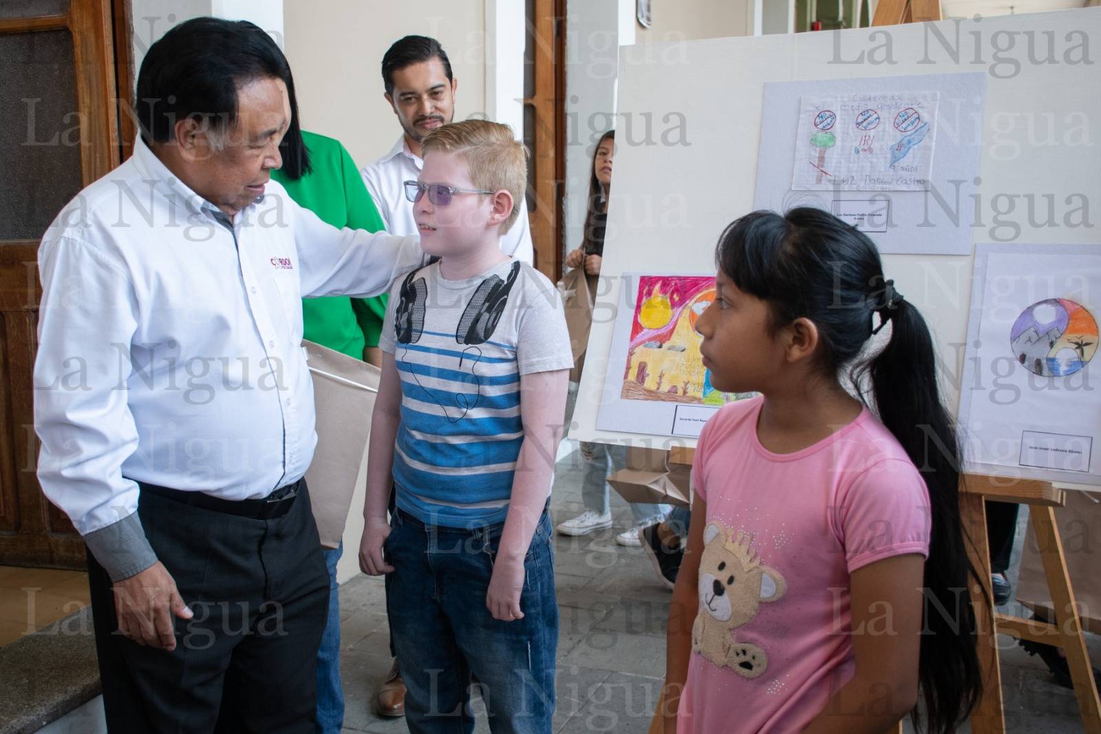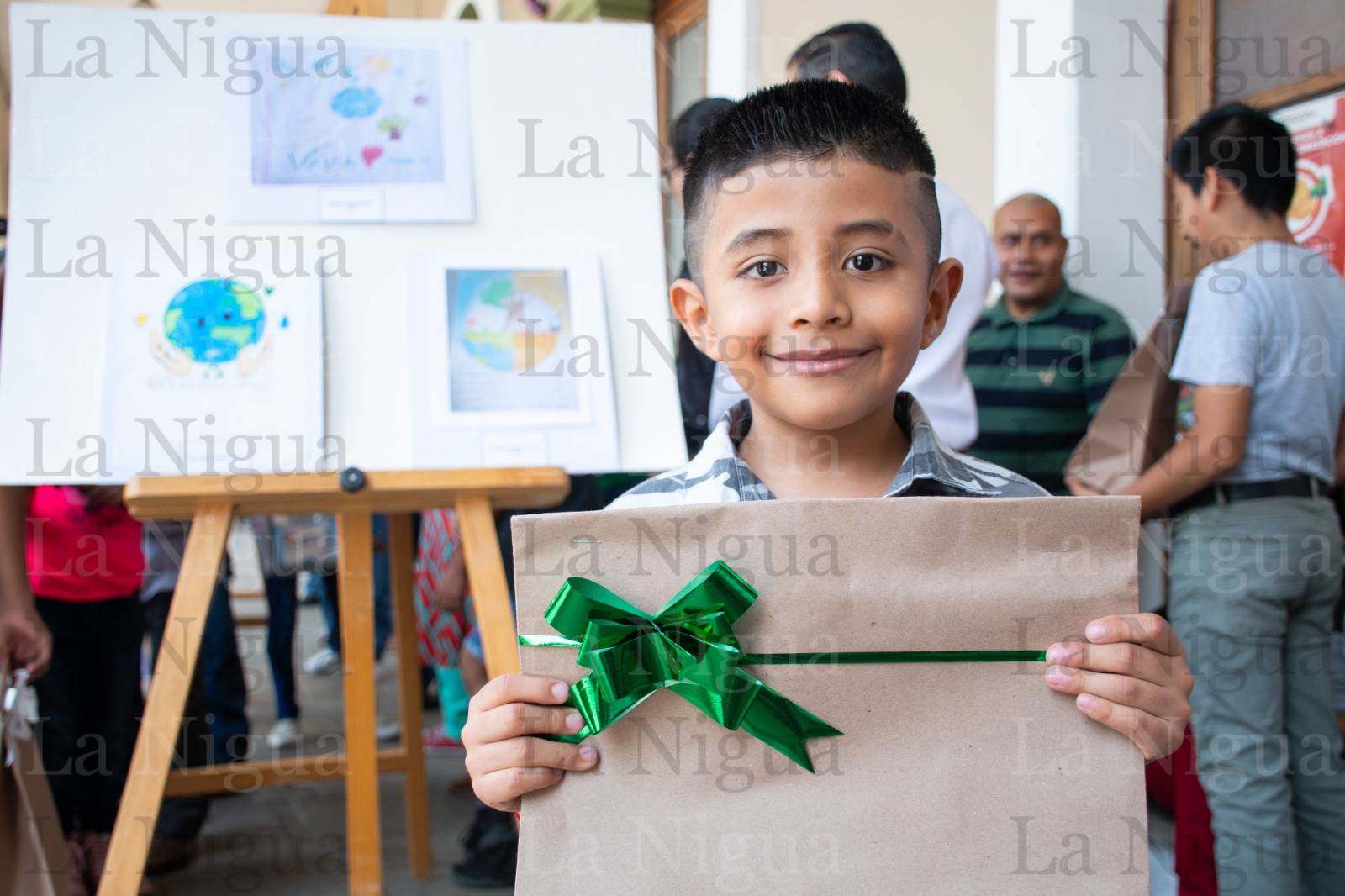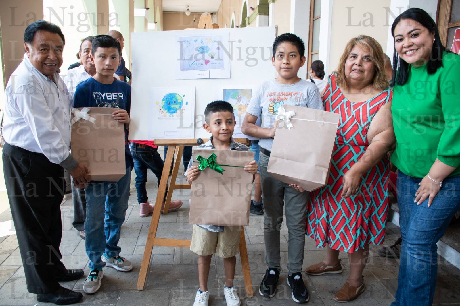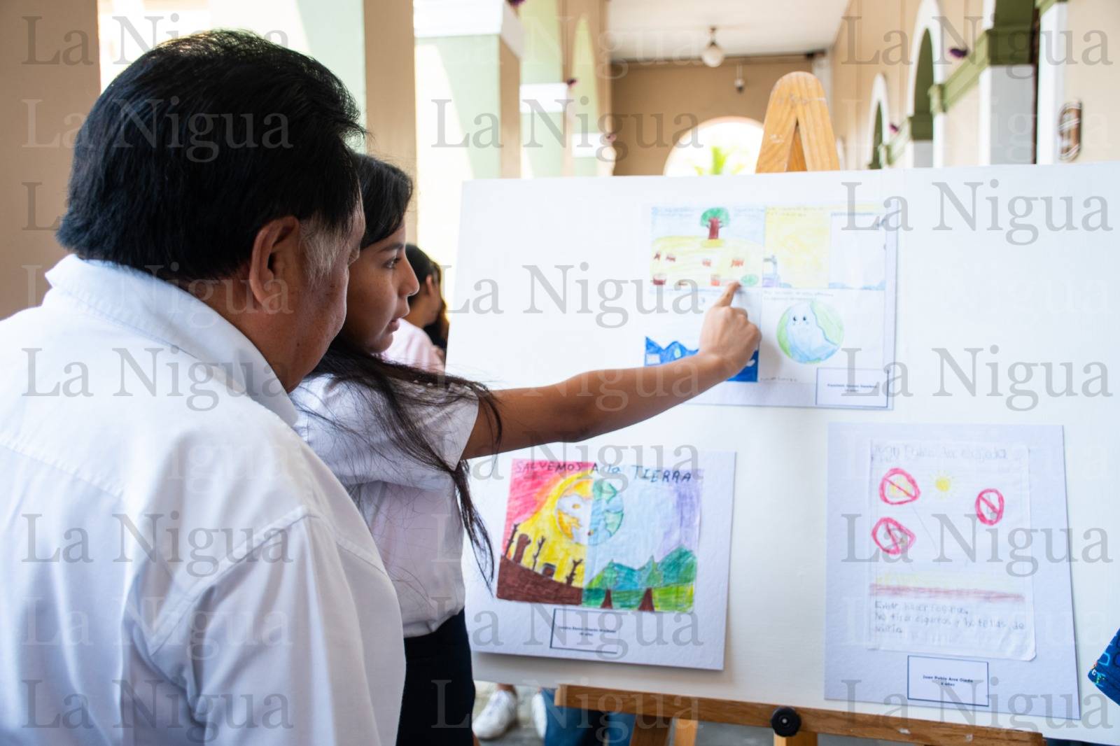 En los bajos del palacio municipal fueron expuestos 22 dibujos realizados por niñas y niños, quienes plasmaron mensajes alusivos a la ecología, sobre el reciclaje, el cuidado del agua, mantener limpia la ciudad, la reforestación, entre otros.